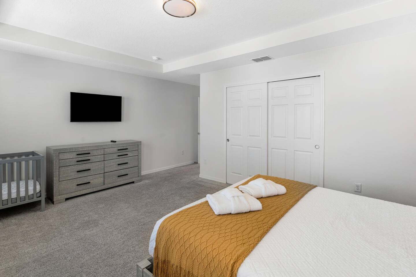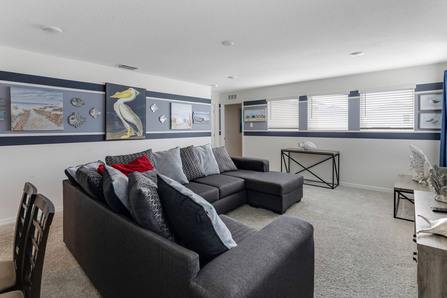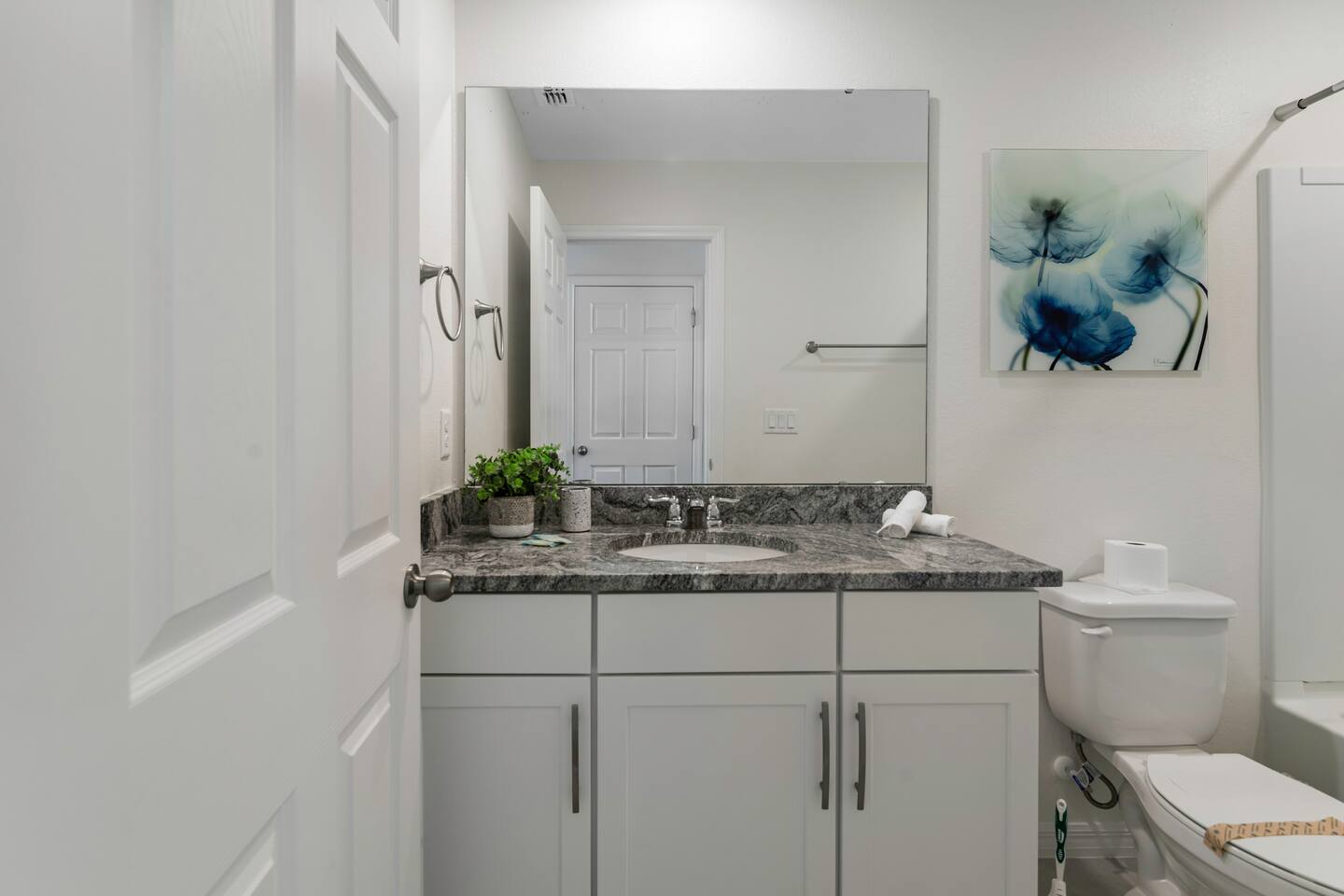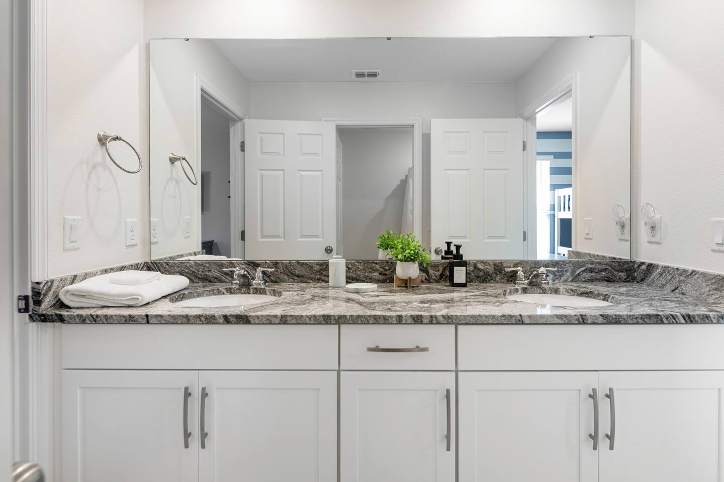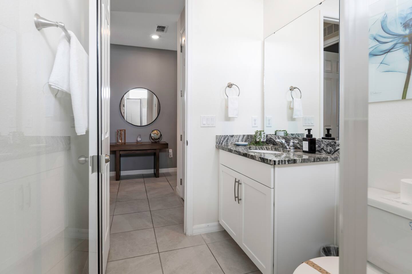 This amazing property features a great spacious layout, comprised of: Downstairs: Master King suite with attached bathroom (walk-in shower) Queen bedroom with adjacent bathroom (walk in shower) Huge kitchen island, pantry, open floorpan with stylish living room and dining table for 12 guests and of course-the beautiful pool and spa with very private back view. Upstairs: Second living area with it's own TV and seating areas Queen master suite with attached bathroom (walk in shower) Queen suite with attached bathroom (tub shower combo) Detached Queen bedroom Detached full bathroom (tub shower combo) Jack and Jill bathroom (tub shower combo) serving the jungle bedroom with a full and a twin beds and the Surfer's bedroom with 2 full bedrooms. The home also features a dedicated laundry area, a fully functioning garage with automatic opener and all of the baby essentials, such as an actual crib, pack and play and high chair. The home accommodates up to 3 standard size vehicles, between the garage and driveway. This is hands down the best value at Solara!