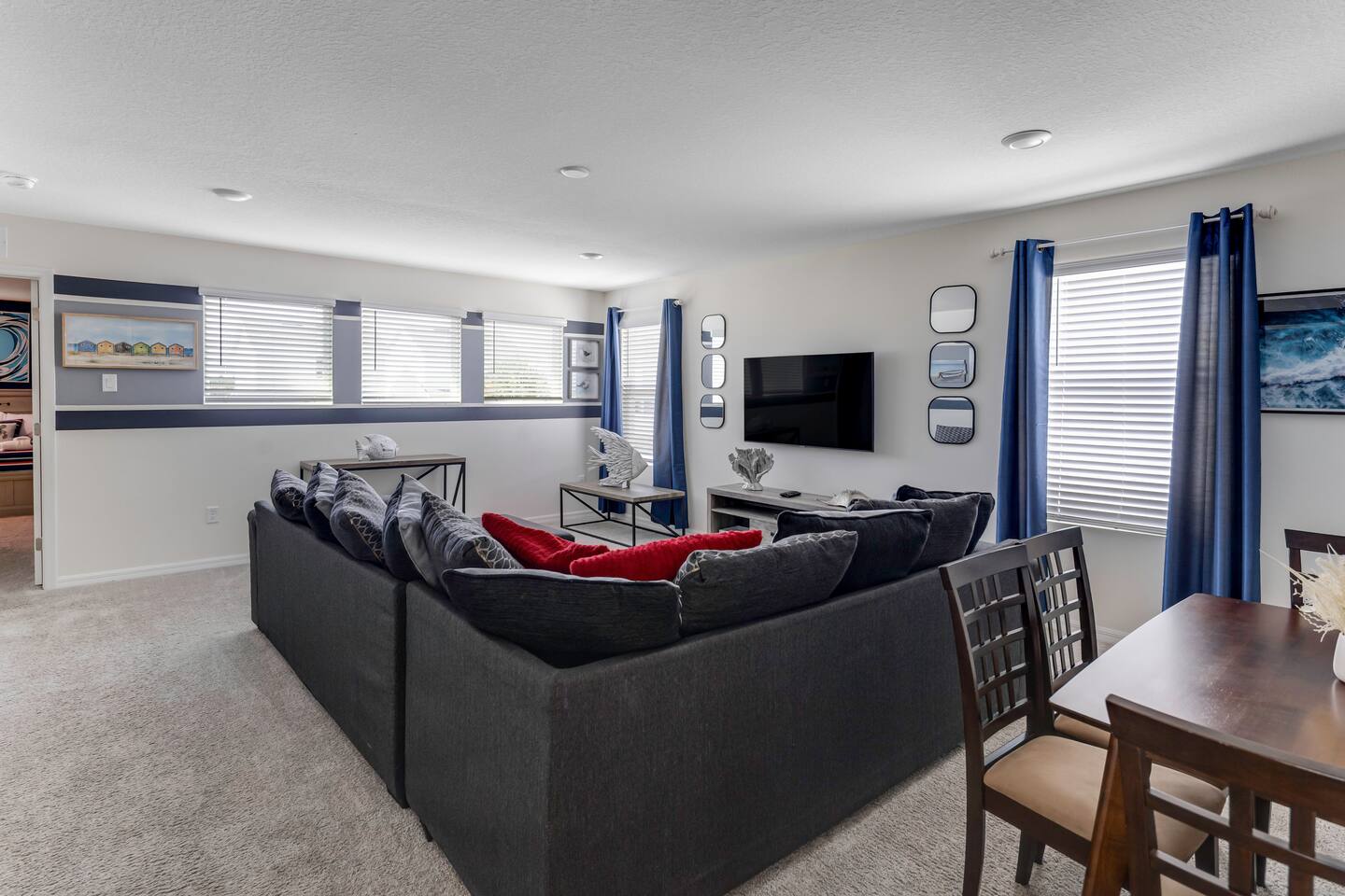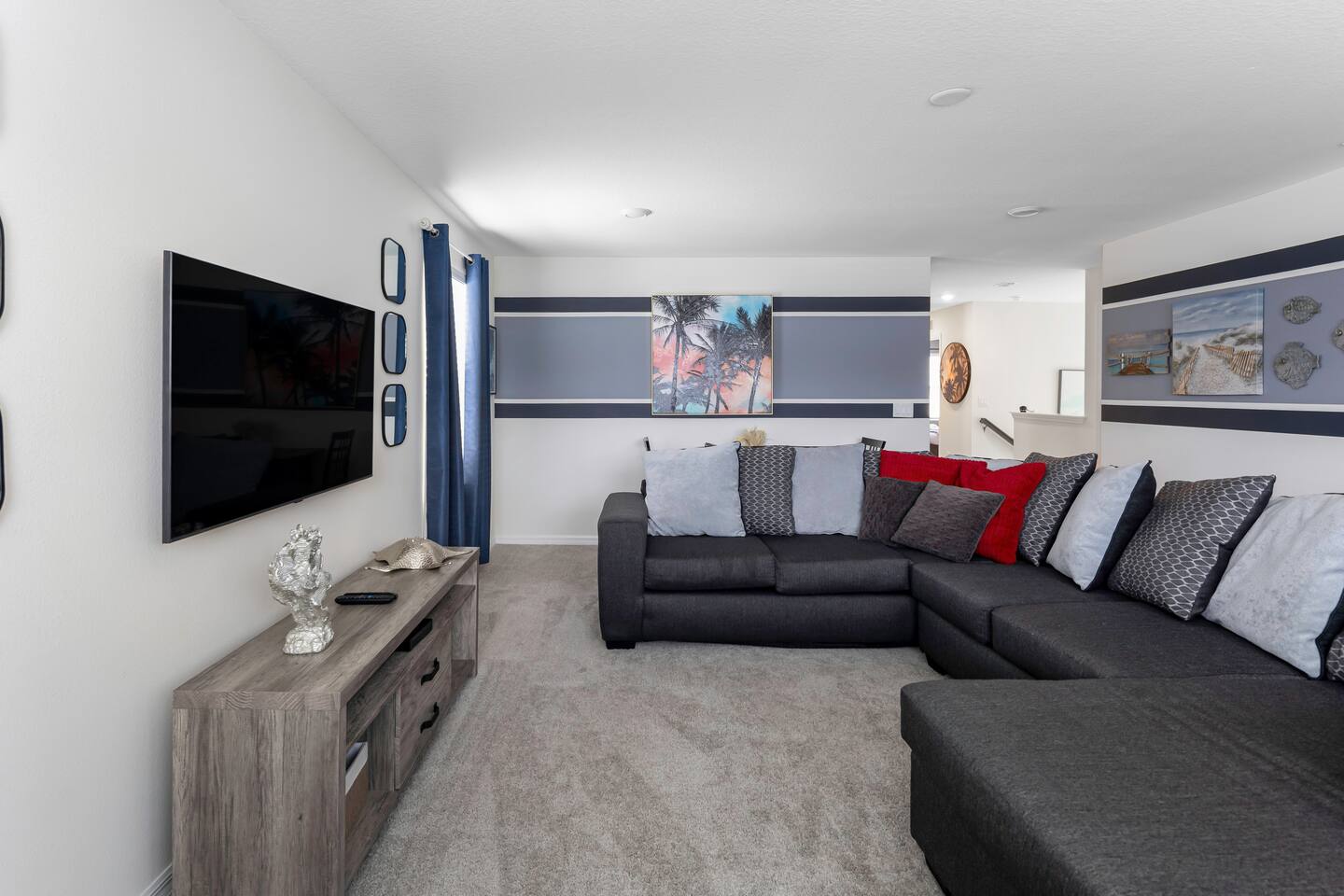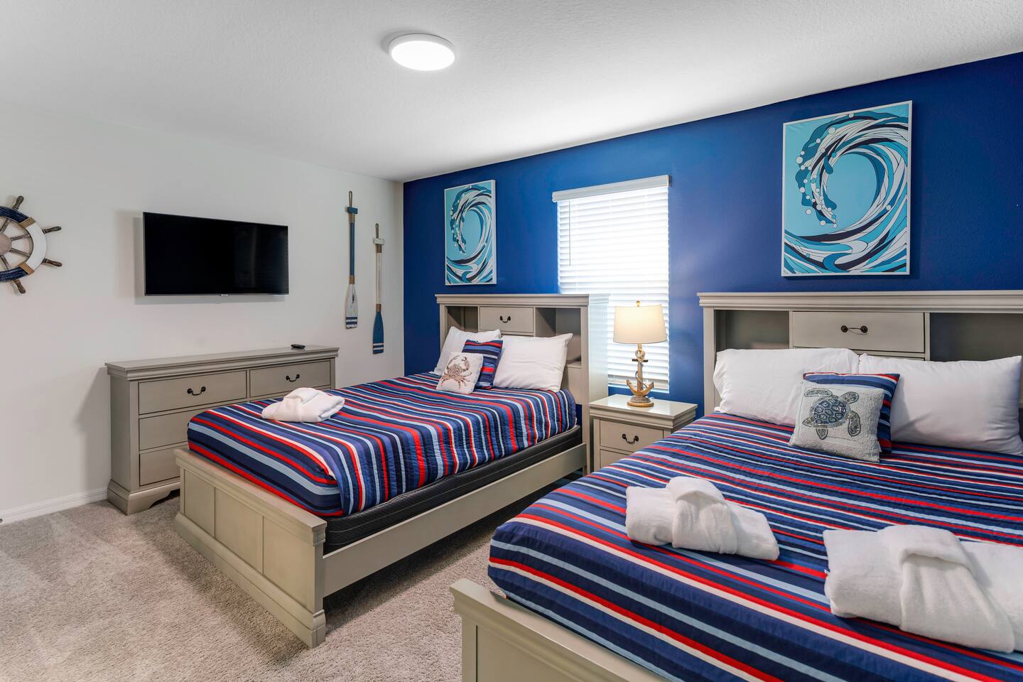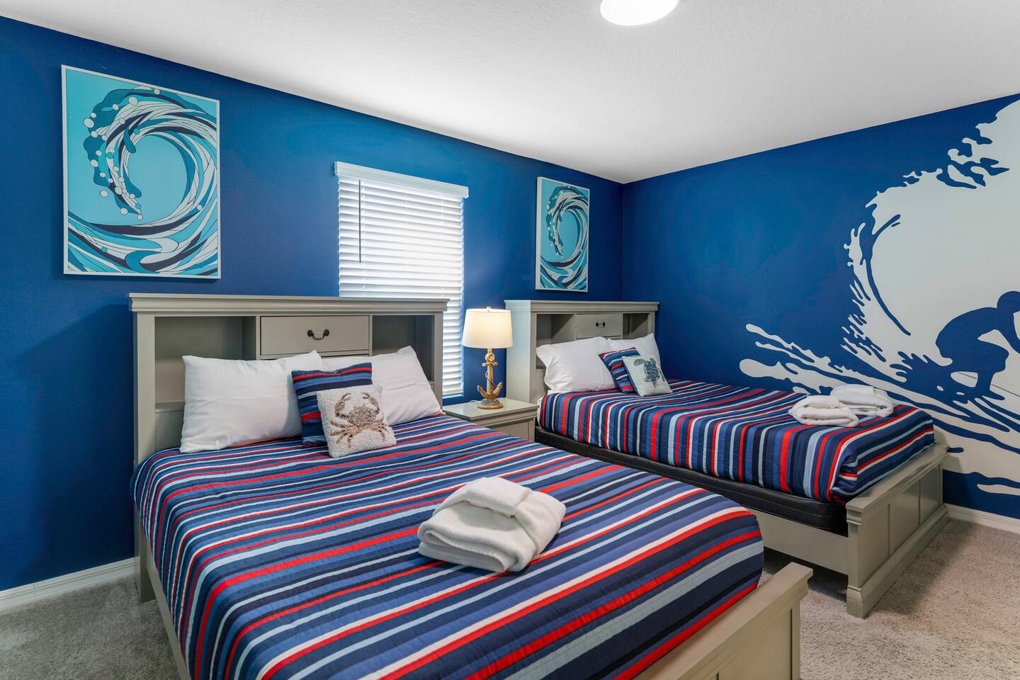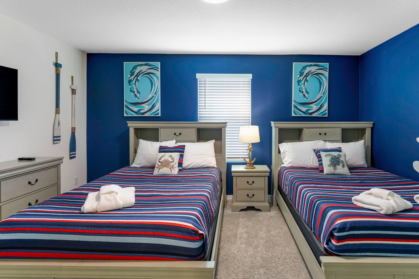This amazing property features a great spacious layout, comprised of: Downstairs: Master King suite with attached bathroom (walk-in shower) Queen bedroom with adjacent bathroom (walk in shower) Huge kitchen island, pantry, open floorpan with stylish living room and dining table for 12 guests and of course-the beautiful pool and spa with very private back view. Upstairs: Second living area with it's own TV and seating areas Queen master suite with attached bathroom (walk in shower) Queen suite with attached bathroom (tub shower combo) Detached Queen bedroom Detached full bathroom (tub shower combo) Jack and Jill bathroom (tub shower combo) serving the jungle bedroom with a full and a twin beds and the Surfer's bedroom with 2 full bedrooms. The home also features a dedicated laundry area, a fully functioning garage with automatic opener and all of the baby essentials, such as an actual crib, pack and play and high chair. The home accommodates up to 3 standard size vehicles, between the garage and driveway. This is hands down the best value at Solara!