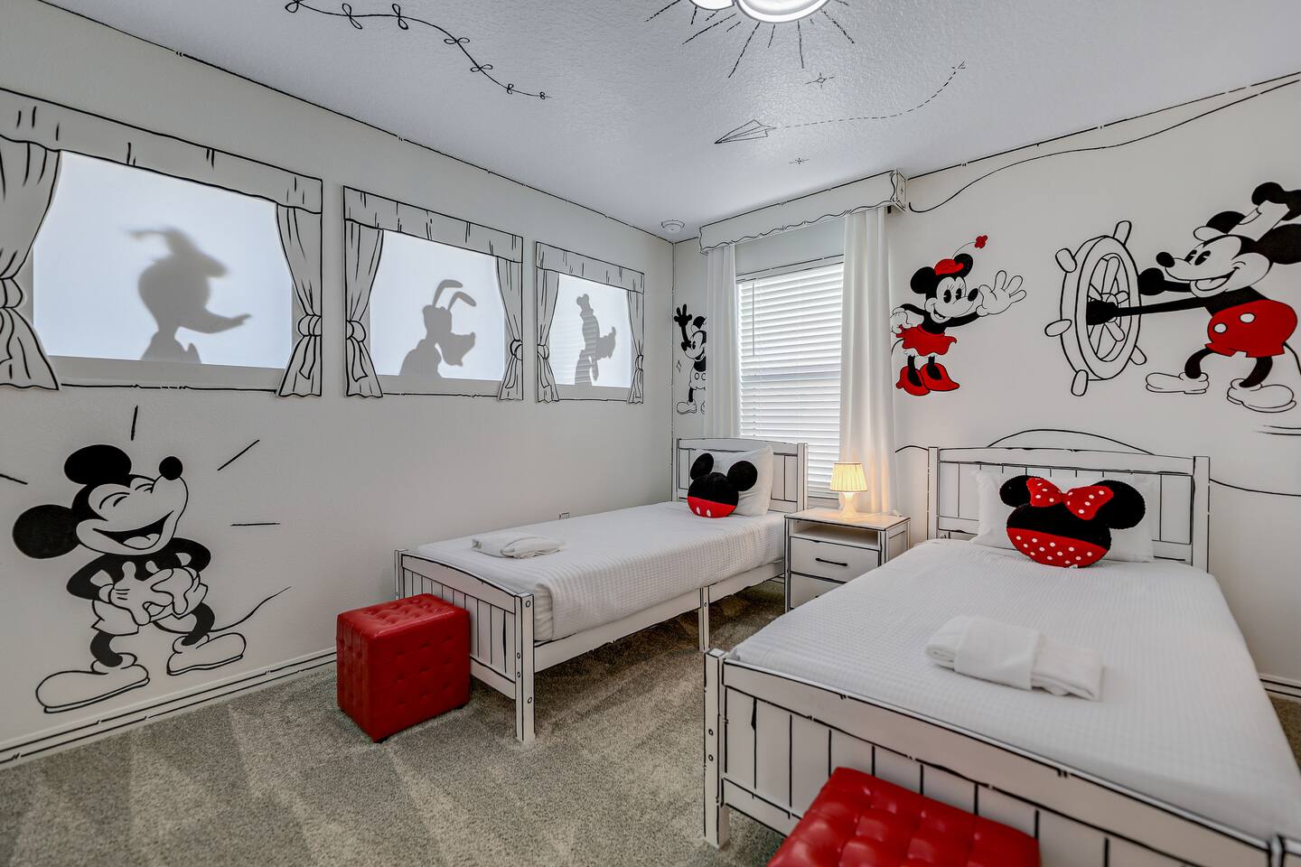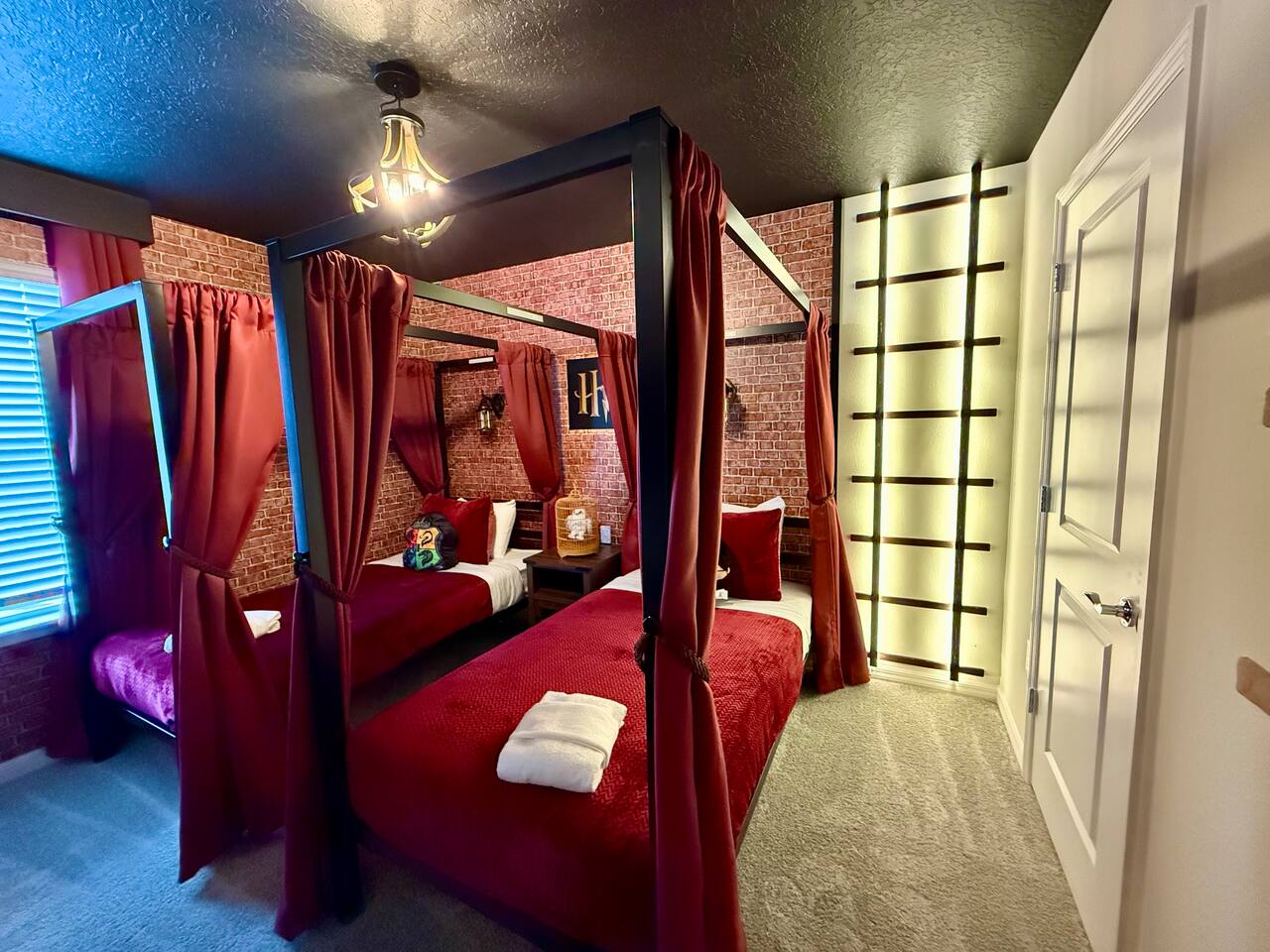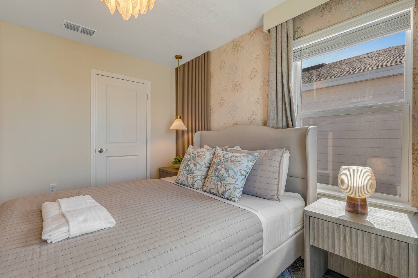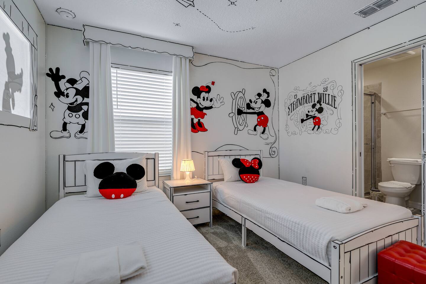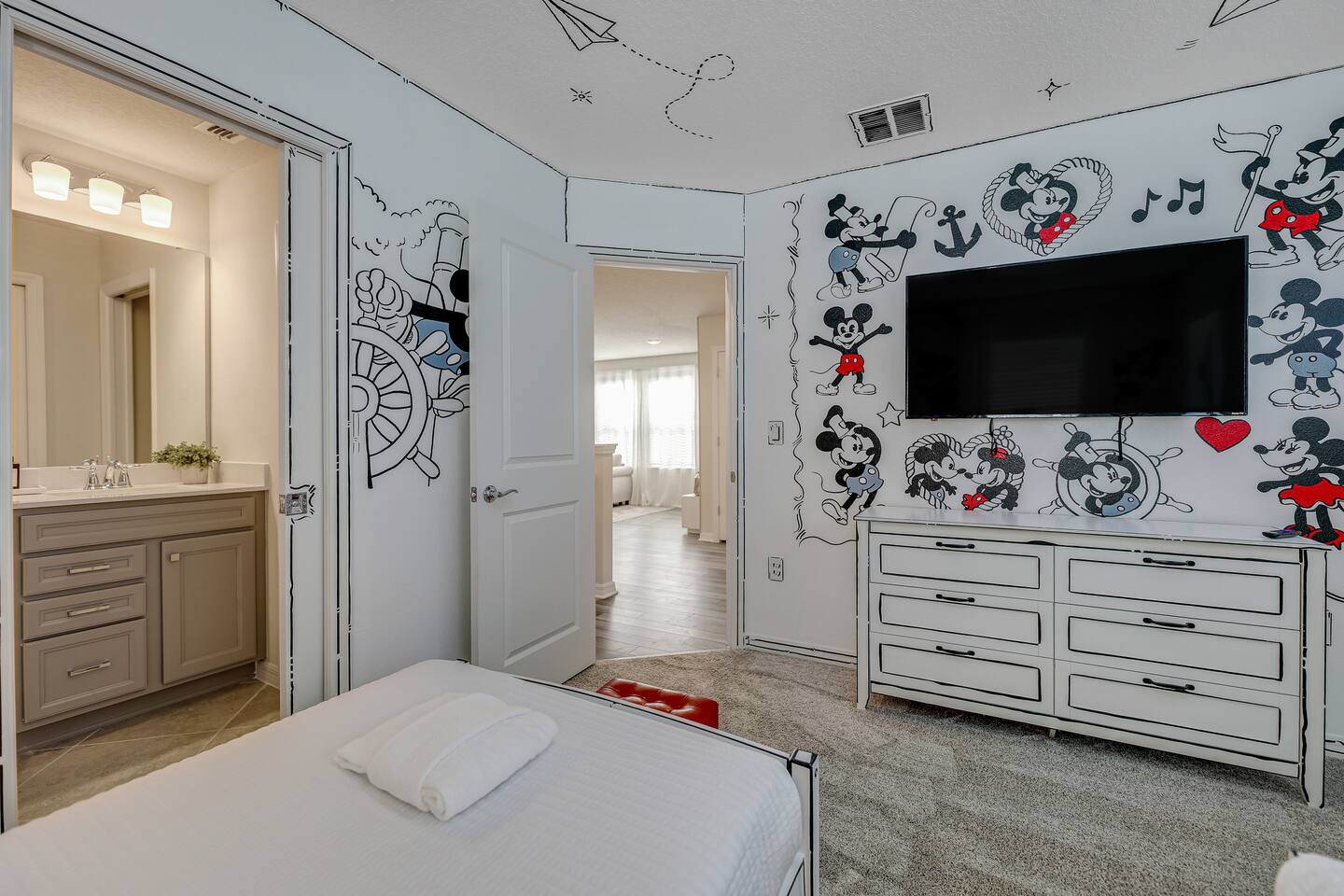 All bedrooms are ensuites, with attached private bathrooms in this amazing property! Bedroom and bathroom configuration: First Floor: King ensuite with walk-in shower and Garden tub ✨ Second Floor: King & Queen ensuite both with Walk in showers 👑 A whimsically HAND PAINTED vintage Mickey and Minnie bedroom, featuring 2 twin size bedrooms and attached bathroom ⚓️ A Magical Harry Potter bedroom with 2 post style twin bedrooms and attached bathroom 🪄 This home also features: A half bathroom with pool access and living areas. Gorgeously spacious, integrated and modern living spaces for the entire fam! A second floor bonus TV room, so the family can gather for a cozy movie or game night 🙌🏽 The spacious and beautiful pool deck has been outfitted with additional dining and lounging areas, including a BBQ grill free to use! (BYO Propane) The pool can be heated from 11/1 to 4/30 for a nominal daily charge of $35.00. This green home features solar panels, full size toiletries and a desirable EV charger (BYO EV ;) within the spacious 2 car garage. The Windsor Cay Clubhouse features *Fully equipped Gym/Fitness Center *Zero-Entry Pool *Lazy River *Children's Splash Park *Double Water Slides *Spa/Hot Tub *Bar *Play areas *Family size Cabanas *Mini-Golf *Fire Pit *Picnic Area *Hammock Garden *Cornhole court *Basketball *Sand Volleyball *Game Room and lounge *Convenience Store *Coffee and Ice Cream Shop There is no resort charge attached to the reservation and guests are able to use all pools, slides, gym, and play areas free of charge. Some individual amenities however (such as arcade games and the Cabanas) may have an extra nominal fee to use. Welcome to your storybook paradise in beautiful sunny central Florida ☺️☀️