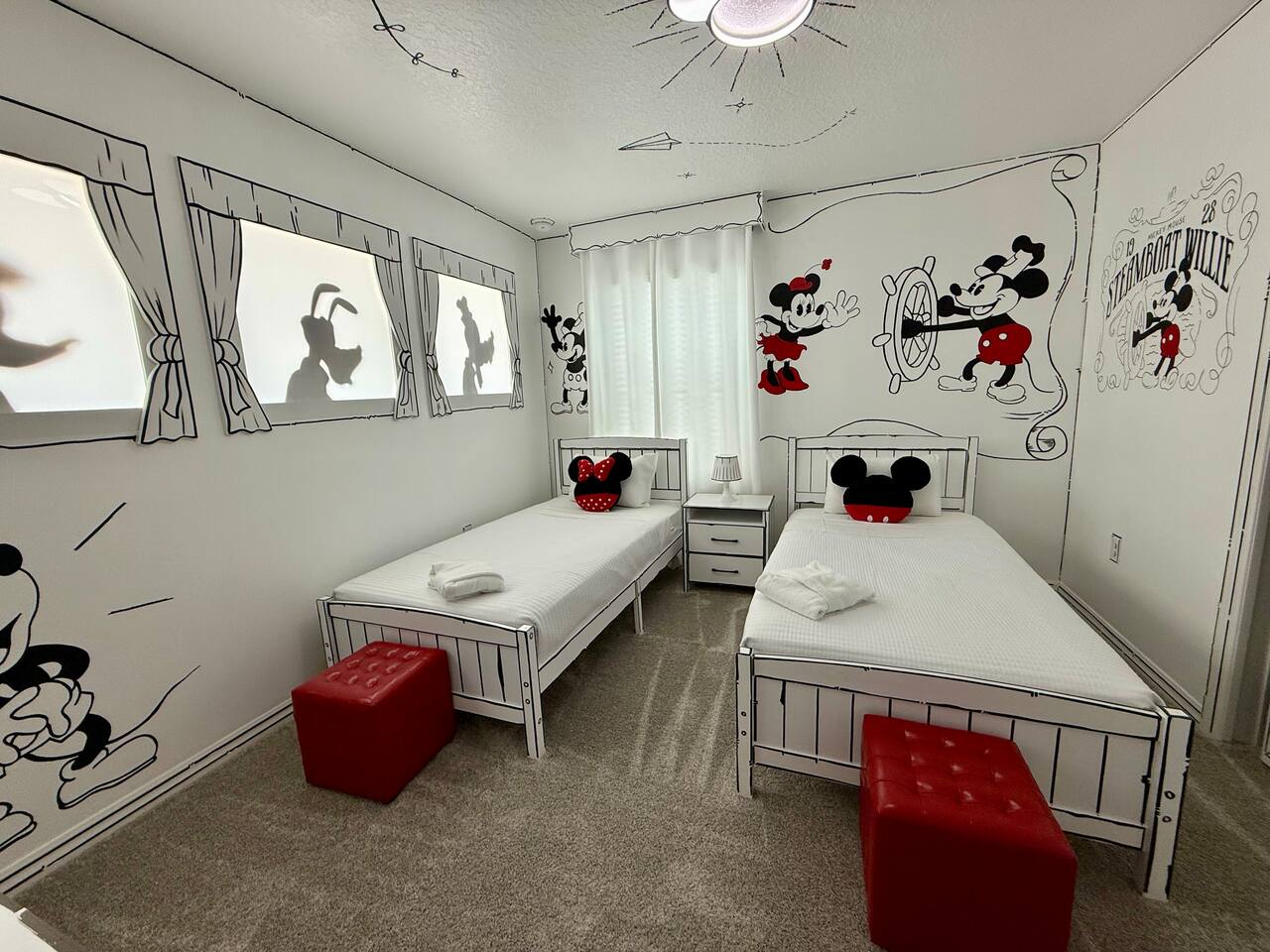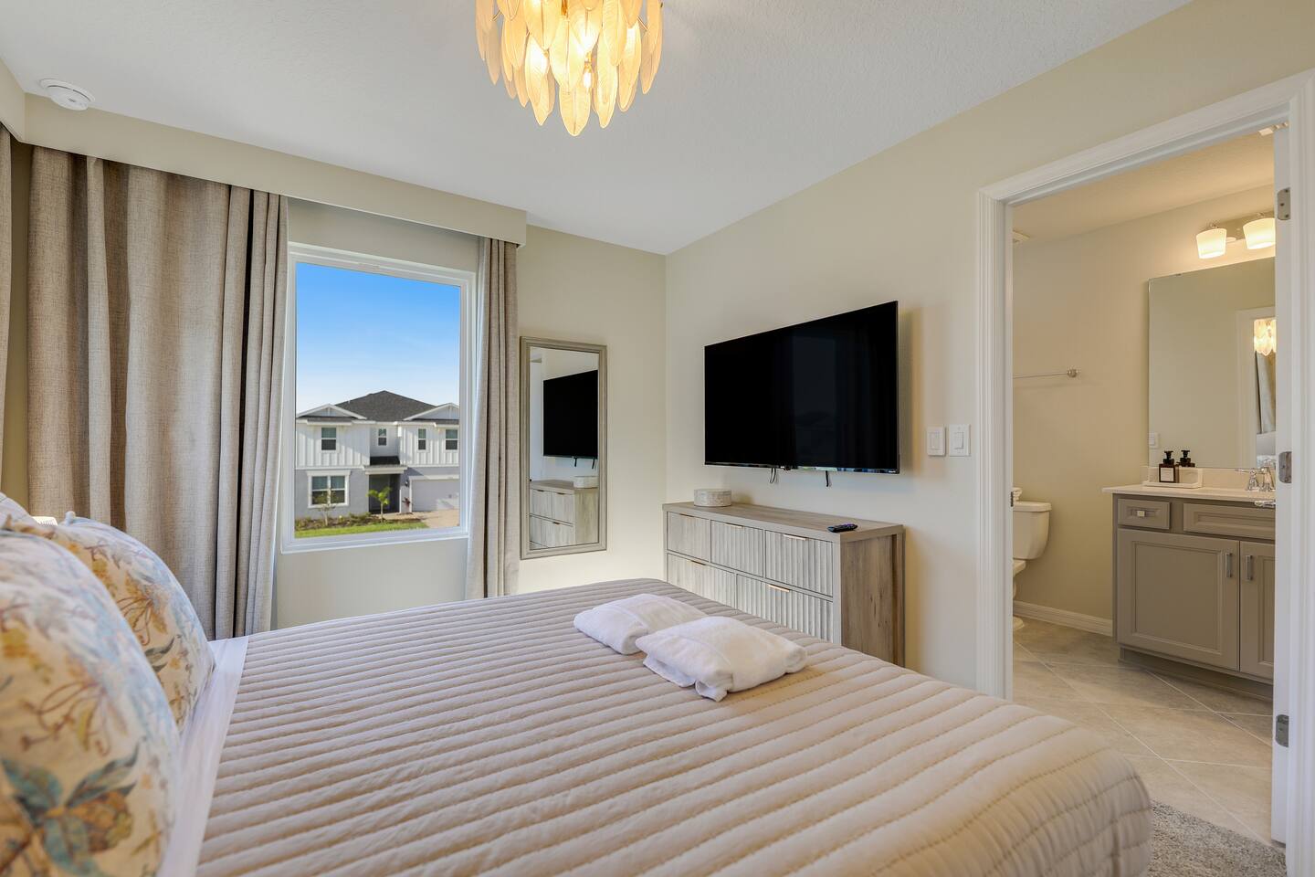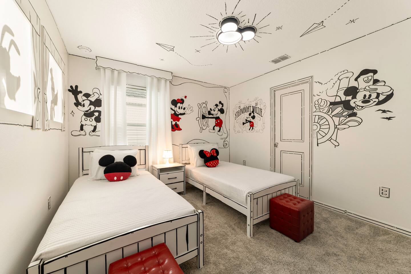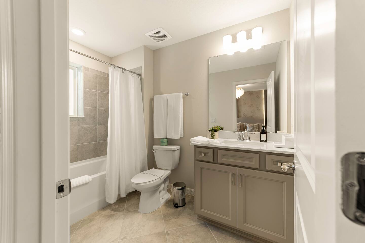 All bedrooms are ensuites, with attached private bathrooms in this amazing property! Bedroom and bathroom configuration: First Floor: King ensuite with walk-in shower and Garden tub ✨ Second Floor: King & Queen ensuite both with Walk in showers 👑 A whimsically HAND PAINTED vintage Mickey and Minnie bedroom, featuring 2 twin size bedrooms and attached bathroom ⚓️ A Magical Harry Potter bedroom with 2 post style twin bedrooms and attached bathroom 🪄 This home also features: A half bathroom with pool access and living areas. Gorgeously spacious, integrated and modern living spaces for the entire fam! A second floor bonus TV room, so the family can gather for a cozy movie or game night 🙌🏽 The spacious and beautiful pool deck has been outfitted with additional dining and lounging areas, including a BBQ grill free to use! (BYO Propane) The pool can be heated from 11/1 to 4/30 for a nominal daily charge of $35.00. This green home features solar panels, full size toiletries and a desirable EV charger (BYO EV ;) within the spacious 2 car garage. The Windsor Cay Clubhouse features *Fully equipped Gym/Fitness Center *Zero-Entry Pool *Lazy River *Children's Splash Park *Double Water Slides *Spa/Hot Tub *Bar *Play areas *Family size Cabanas *Mini-Golf *Fire Pit *Picnic Area *Hammock Garden *Cornhole court *Basketball *Sand Volleyball *Game Room and lounge *Convenience Store *Coffee and Ice Cream Shop There is no resort charge attached to the reservation and guests are able to use all pools, slides, gym, and play areas free of charge. Some individual amenities however (such as arcade games and the Cabanas) may have an extra nominal fee to use. Welcome to your storybook paradise in beautiful sunny central Florida ☺️☀️