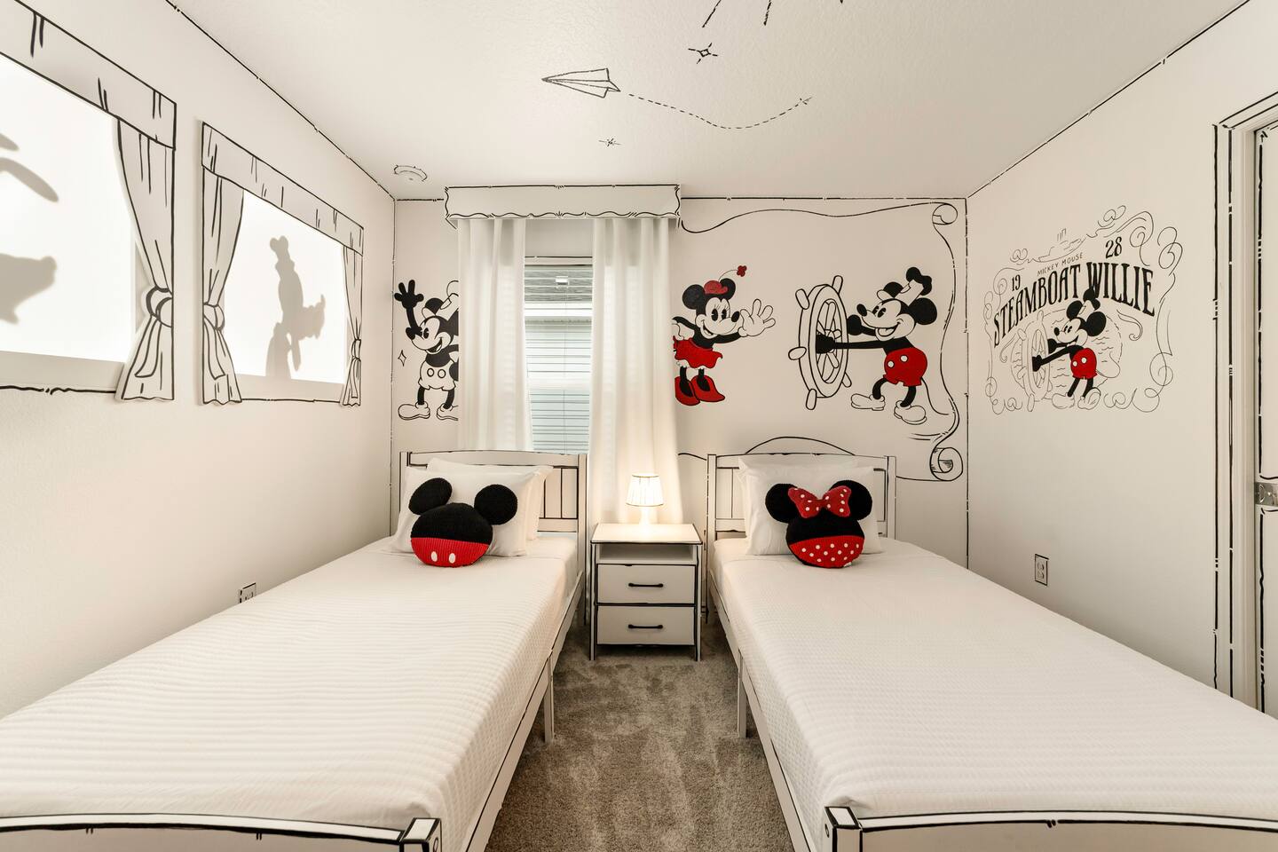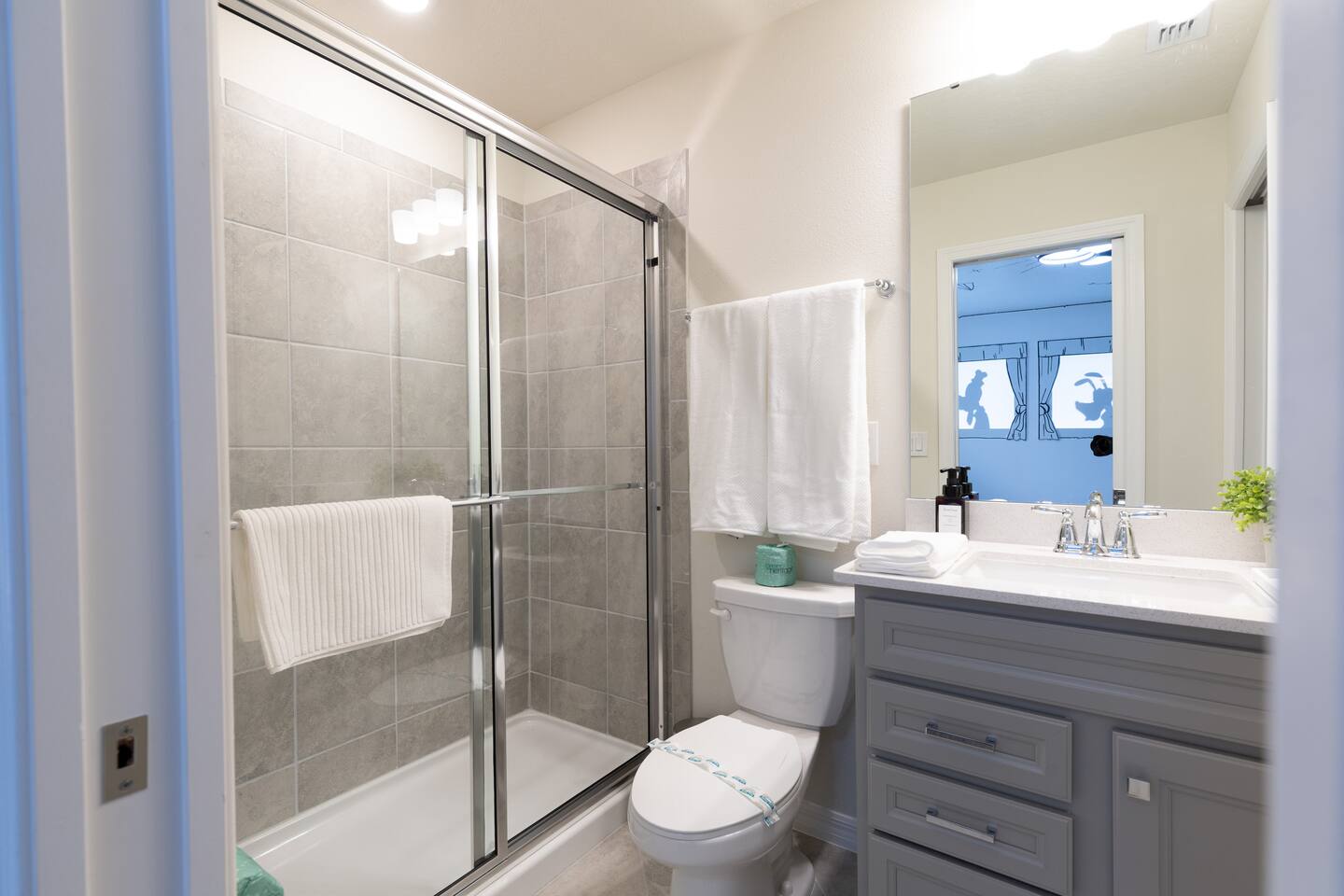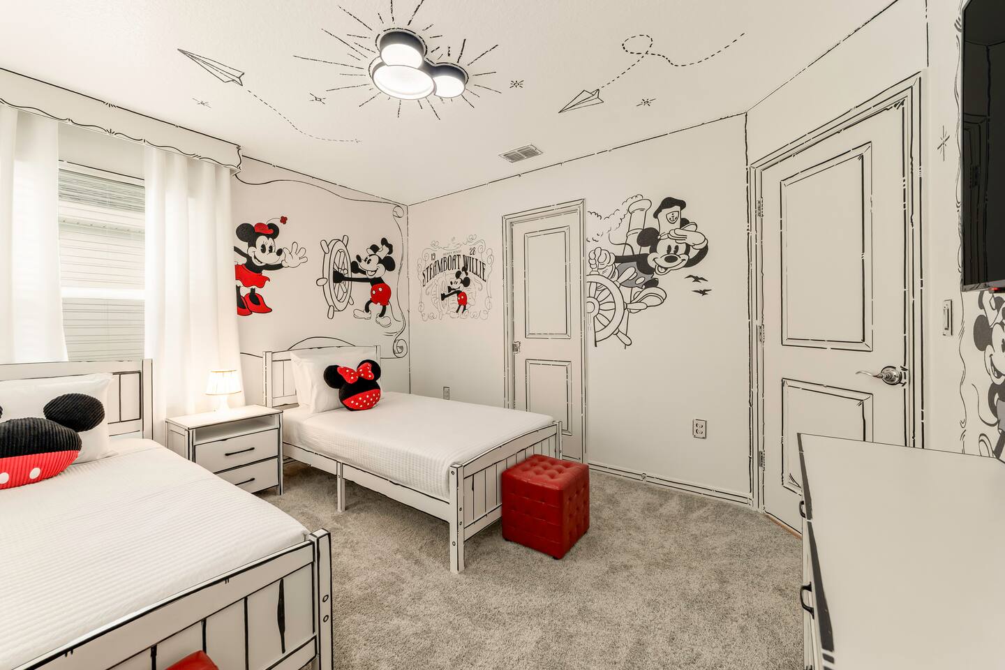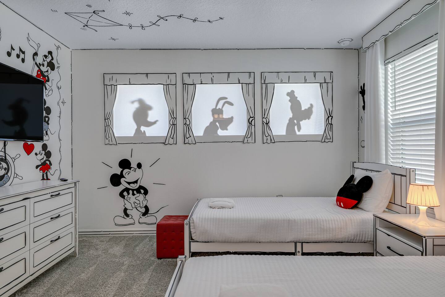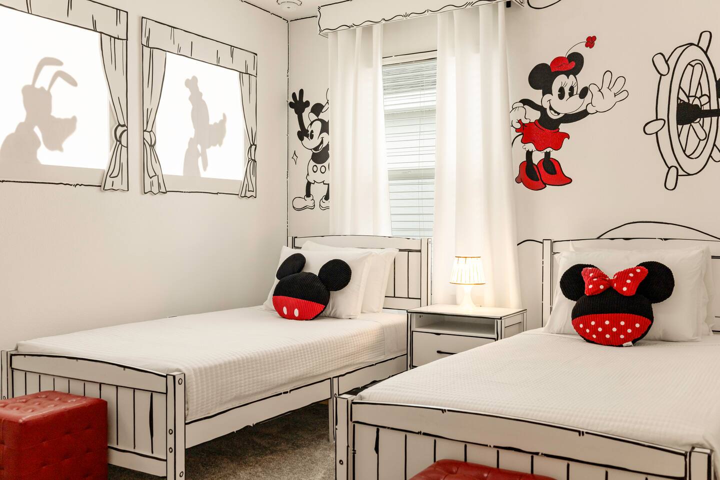 All bedrooms are ensuites, with attached private bathrooms in this amazing property! Bedroom and bathroom configuration: First Floor: King ensuite with walk-in shower and Garden tub ✨ Second Floor: King & Queen ensuite both with Walk in showers 👑 A whimsically HAND PAINTED vintage Mickey and Minnie bedroom, featuring 2 twin size bedrooms and attached bathroom ⚓️ A Magical Harry Potter bedroom with 2 post style twin bedrooms and attached bathroom 🪄 This home also features: A half bathroom with pool access and living areas. Gorgeously spacious, integrated and modern living spaces for the entire fam! A second floor bonus TV room, so the family can gather for a cozy movie or game night 🙌🏽 The spacious and beautiful pool deck has been outfitted with additional dining and lounging areas, including a BBQ grill free to use! (BYO Propane) The pool can be heated from 11/1 to 4/30 for a nominal daily charge of $35.00. This green home features solar panels, full size toiletries and a desirable EV charger (BYO EV ;) within the spacious 2 car garage. The Windsor Cay Clubhouse features *Fully equipped Gym/Fitness Center *Zero-Entry Pool *Lazy River *Children's Splash Park *Double Water Slides *Spa/Hot Tub *Bar *Play areas *Family size Cabanas *Mini-Golf *Fire Pit *Picnic Area *Hammock Garden *Cornhole court *Basketball *Sand Volleyball *Game Room and lounge *Convenience Store *Coffee and Ice Cream Shop There is no resort charge attached to the reservation and guests are able to use all pools, slides, gym, and play areas free of charge. Some individual amenities however (such as arcade games and the Cabanas) may have an extra nominal fee to use. Welcome to your storybook paradise in beautiful sunny central Florida ☺️☀️