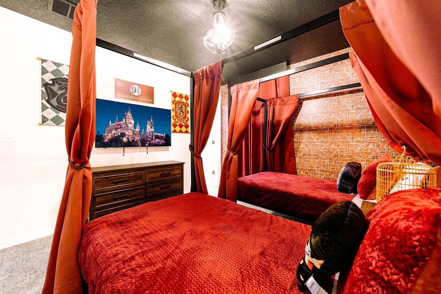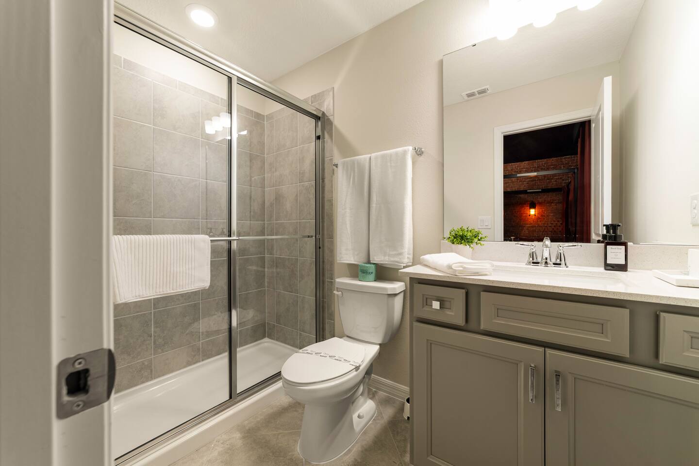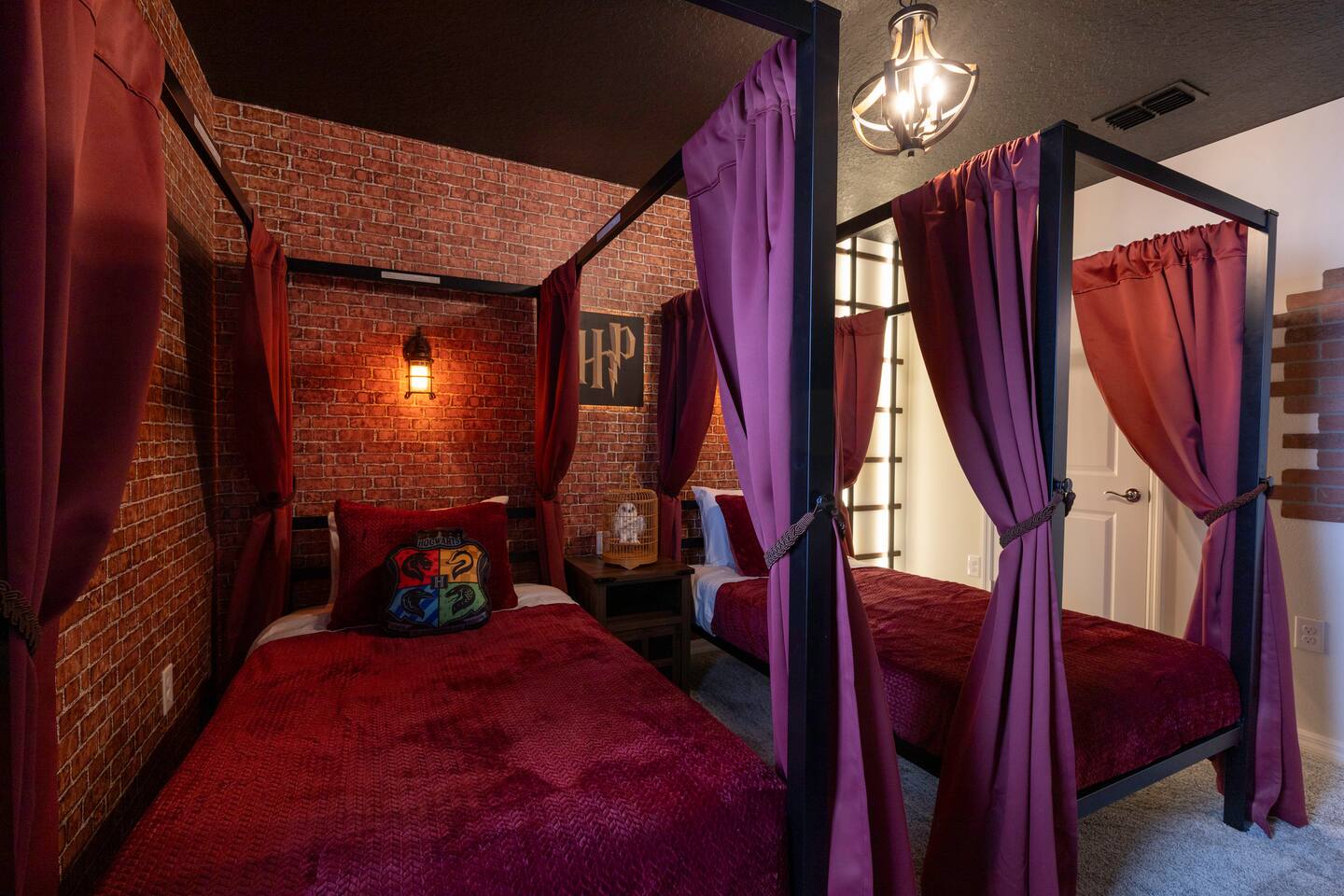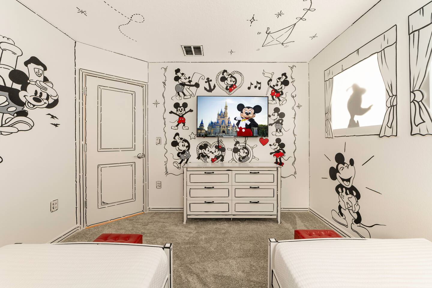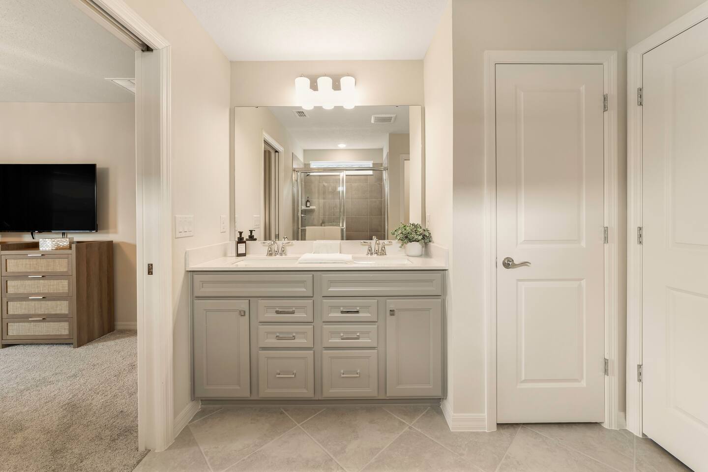 All bedrooms are ensuites, with attached private bathrooms in this amazing property! Bedroom and bathroom configuration: First Floor: King ensuite with walk-in shower and Garden tub ✨ Second Floor: King & Queen ensuite both with Walk in showers 👑 A whimsically HAND PAINTED vintage Mickey and Minnie bedroom, featuring 2 twin size bedrooms and attached bathroom ⚓️ A Magical Harry Potter bedroom with 2 post style twin bedrooms and attached bathroom 🪄 This home also features: A half bathroom with pool access and living areas. Gorgeously spacious, integrated and modern living spaces for the entire fam! A second floor bonus TV room, so the family can gather for a cozy movie or game night 🙌🏽 The spacious and beautiful pool deck has been outfitted with additional dining and lounging areas, including a BBQ grill free to use! (BYO Propane) The pool can be heated from 11/1 to 4/30 for a nominal daily charge of $35.00. This green home features solar panels, full size toiletries and a desirable EV charger (BYO EV ;) within the spacious 2 car garage. The Windsor Cay Clubhouse features *Fully equipped Gym/Fitness Center *Zero-Entry Pool *Lazy River *Children's Splash Park *Double Water Slides *Spa/Hot Tub *Bar *Play areas *Family size Cabanas *Mini-Golf *Fire Pit *Picnic Area *Hammock Garden *Cornhole court *Basketball *Sand Volleyball *Game Room and lounge *Convenience Store *Coffee and Ice Cream Shop There is no resort charge attached to the reservation and guests are able to use all pools, slides, gym, and play areas free of charge. Some individual amenities however (such as arcade games and the Cabanas) may have an extra nominal fee to use. Welcome to your storybook paradise in beautiful sunny central Florida ☺️☀️