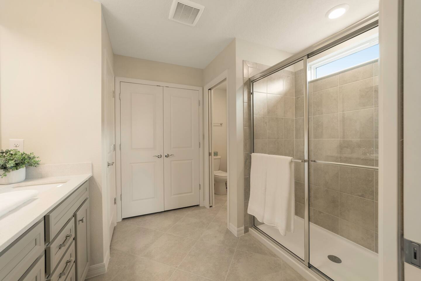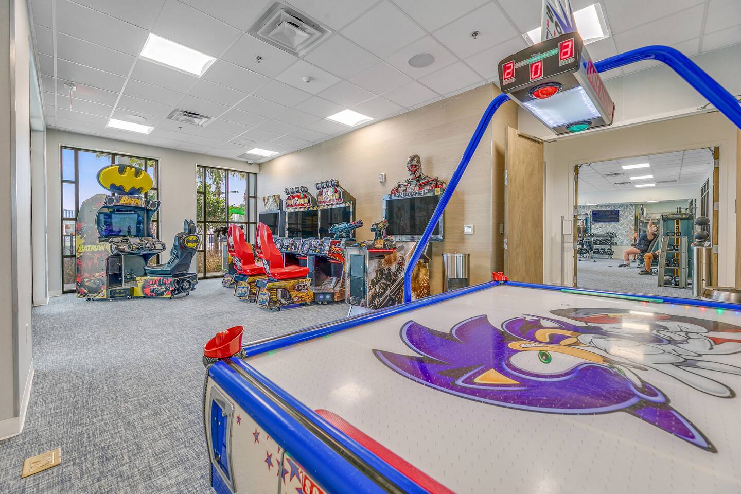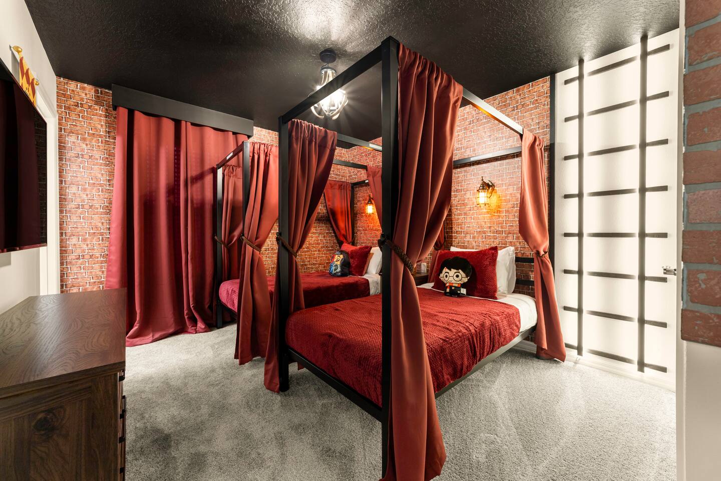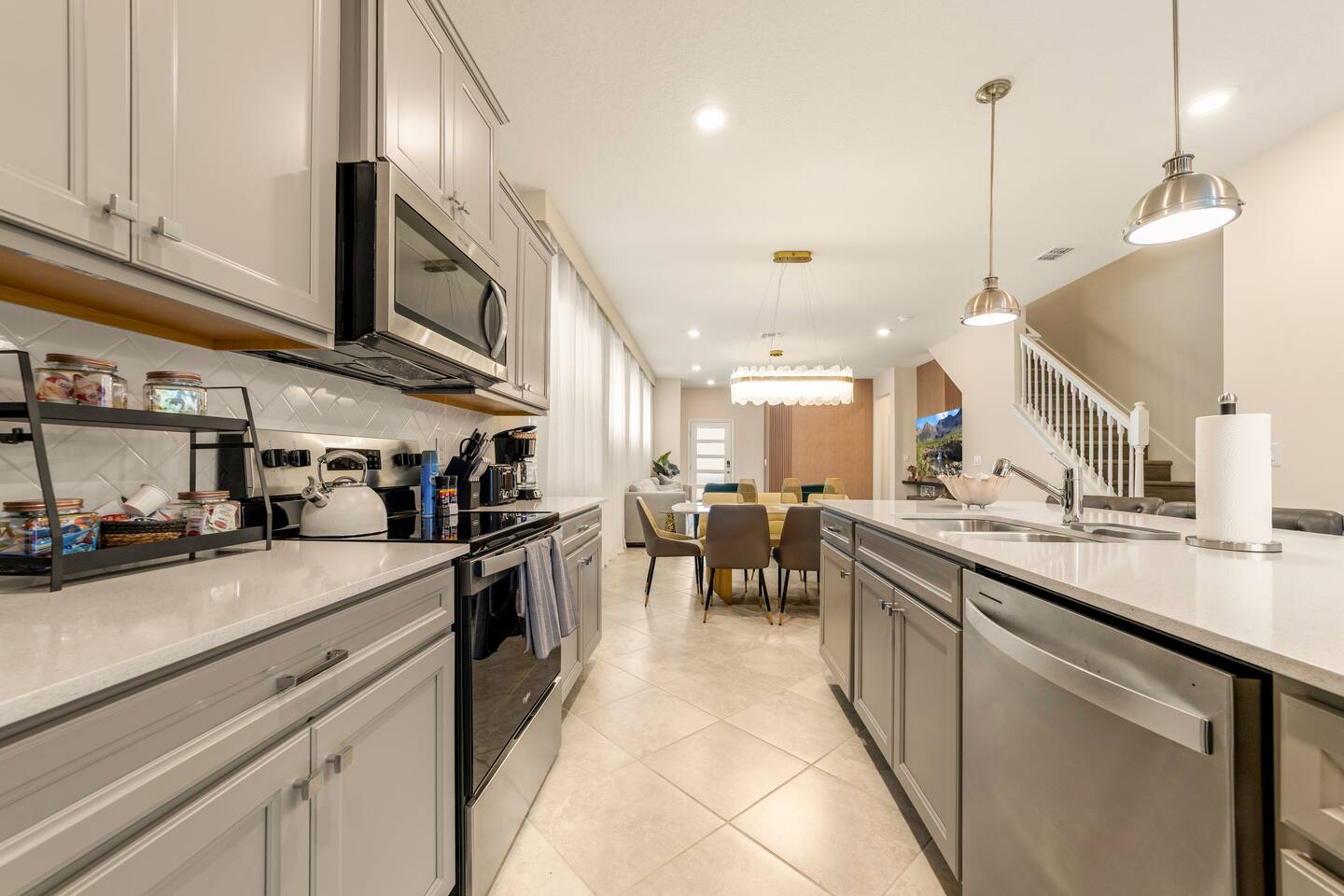 All bedrooms are ensuites, with attached private bathrooms in this amazing property! Bedroom and bathroom configuration: First Floor: King ensuite with walk-in shower and Garden tub ✨ Second Floor: King & Queen ensuite both with Walk in showers 👑 A whimsically HAND PAINTED vintage Mickey and Minnie bedroom, featuring 2 twin size bedrooms and attached bathroom ⚓️ A Magical Harry Potter bedroom with 2 post style twin bedrooms and attached bathroom 🪄 This home also features: A half bathroom with pool access and living areas. Gorgeously spacious, integrated and modern living spaces for the entire fam! A second floor bonus TV room, so the family can gather for a cozy movie or game night 🙌🏽 The spacious and beautiful pool deck has been outfitted with additional dining and lounging areas, including a BBQ grill free to use! (BYO Propane) The pool can be heated from 11/1 to 4/30 for a nominal daily charge of $35.00. This green home features solar panels, full size toiletries and a desirable EV charger (BYO EV ;) within the spacious 2 car garage. The Windsor Cay Clubhouse features *Fully equipped Gym/Fitness Center *Zero-Entry Pool *Lazy River *Children's Splash Park *Double Water Slides *Spa/Hot Tub *Bar *Play areas *Family size Cabanas *Mini-Golf *Fire Pit *Picnic Area *Hammock Garden *Cornhole court *Basketball *Sand Volleyball *Game Room and lounge *Convenience Store *Coffee and Ice Cream Shop There is no resort charge attached to the reservation and guests are able to use all pools, slides, gym, and play areas free of charge. Some individual amenities however (such as arcade games and the Cabanas) may have an extra nominal fee to use. Welcome to your storybook paradise in beautiful sunny central Florida ☺️☀️