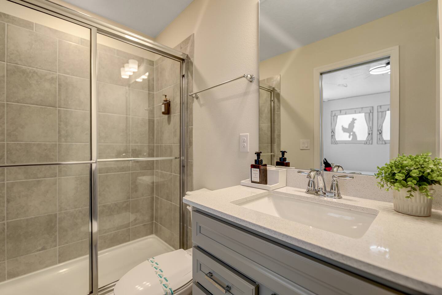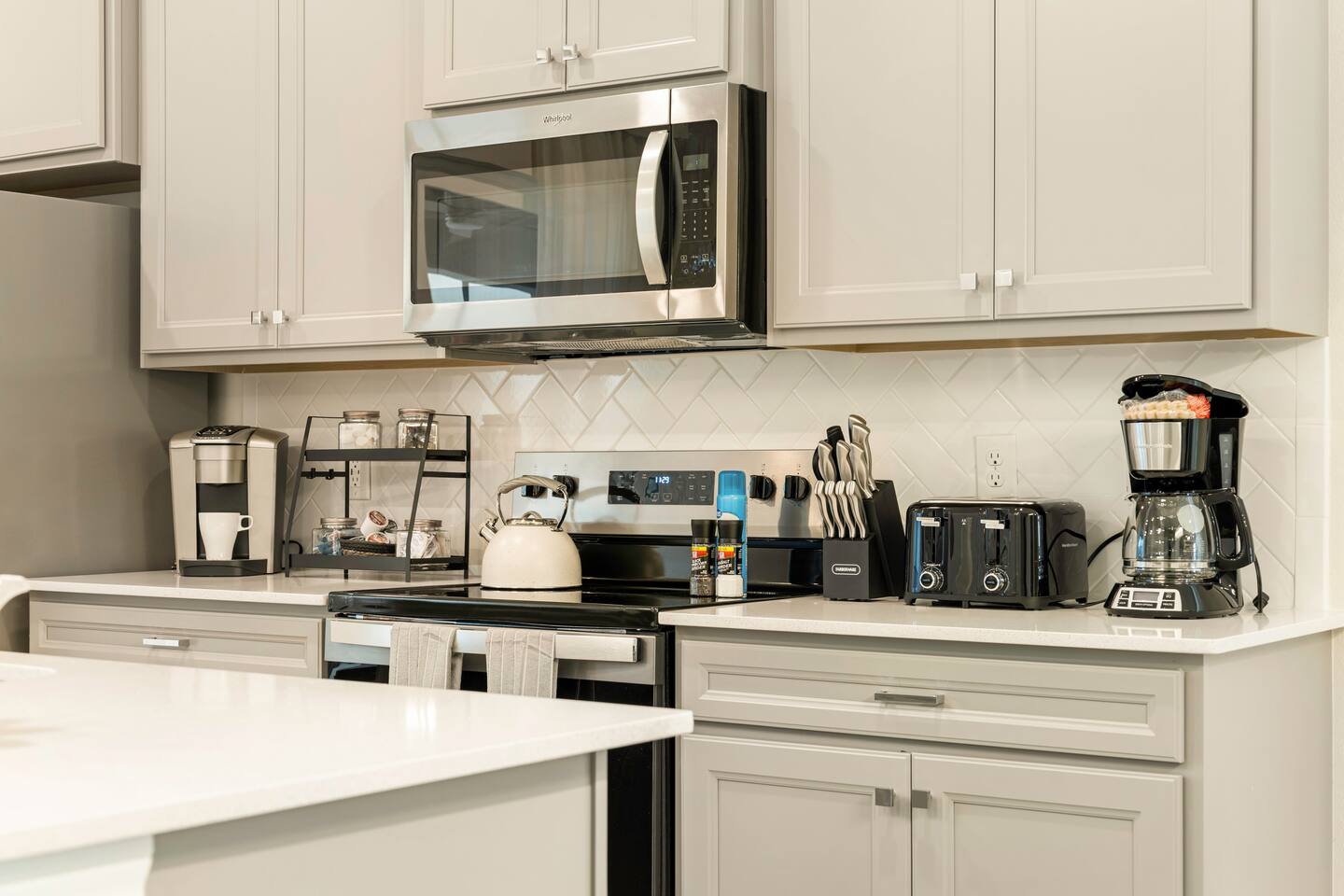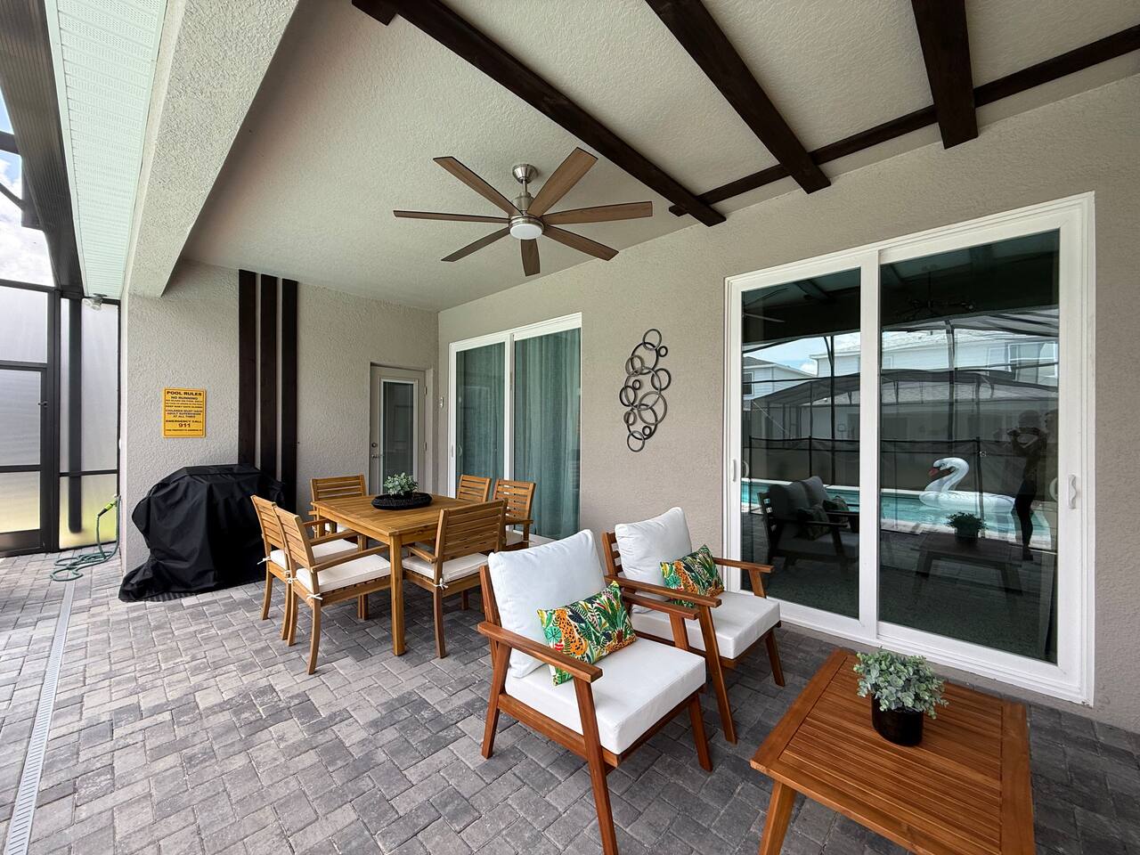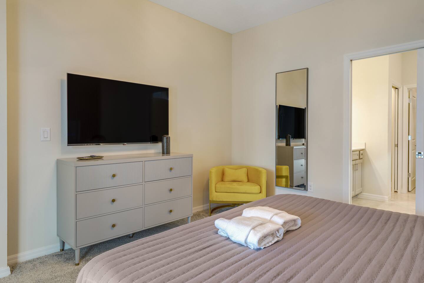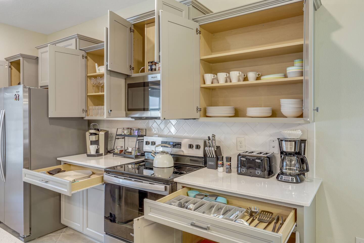 All bedrooms are ensuites, with attached private bathrooms in this amazing property! Bedroom and bathroom configuration: First Floor: King ensuite with walk-in shower and Garden tub ✨ Second Floor: King & Queen ensuite both with Walk in showers 👑 A whimsically HAND PAINTED vintage Mickey and Minnie bedroom, featuring 2 twin size bedrooms and attached bathroom ⚓️ A Magical Harry Potter bedroom with 2 post style twin bedrooms and attached bathroom 🪄 This home also features: A half bathroom with pool access and living areas. Gorgeously spacious, integrated and modern living spaces for the entire fam! A second floor bonus TV room, so the family can gather for a cozy movie or game night 🙌🏽 The spacious and beautiful pool deck has been outfitted with additional dining and lounging areas, including a BBQ grill free to use! (BYO Propane) The pool can be heated from 11/1 to 4/30 for a nominal daily charge of $35.00. This green home features solar panels, full size toiletries and a desirable EV charger (BYO EV ;) within the spacious 2 car garage. The Windsor Cay Clubhouse features *Fully equipped Gym/Fitness Center *Zero-Entry Pool *Lazy River *Children's Splash Park *Double Water Slides *Spa/Hot Tub *Bar *Play areas *Family size Cabanas *Mini-Golf *Fire Pit *Picnic Area *Hammock Garden *Cornhole court *Basketball *Sand Volleyball *Game Room and lounge *Convenience Store *Coffee and Ice Cream Shop There is no resort charge attached to the reservation and guests are able to use all pools, slides, gym, and play areas free of charge. Some individual amenities however (such as arcade games and the Cabanas) may have an extra nominal fee to use. Welcome to your storybook paradise in beautiful sunny central Florida ☺️☀️
