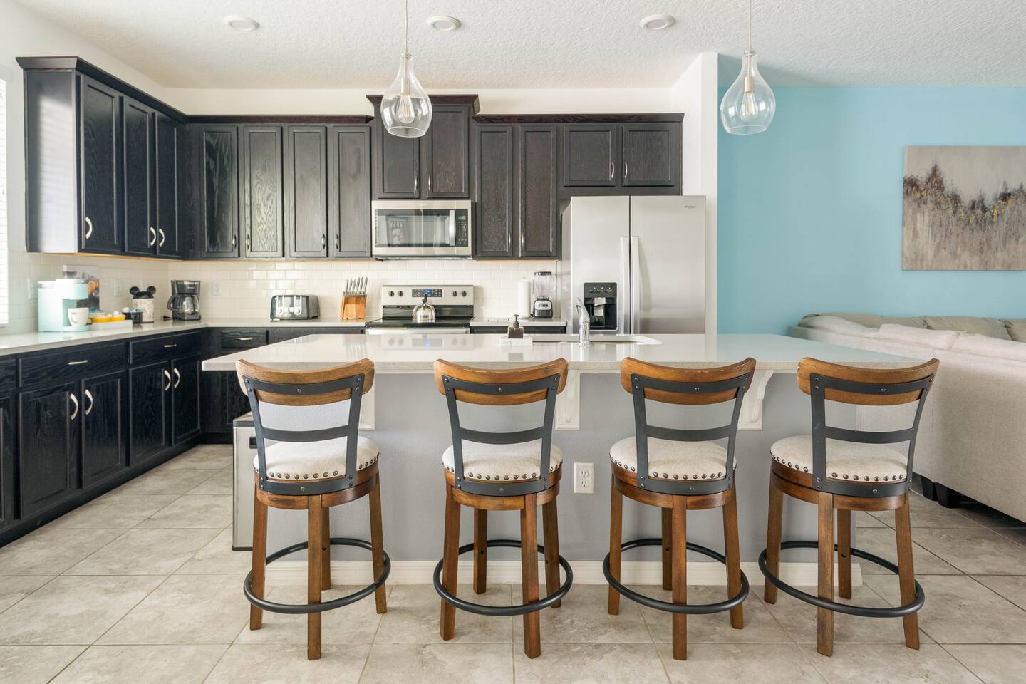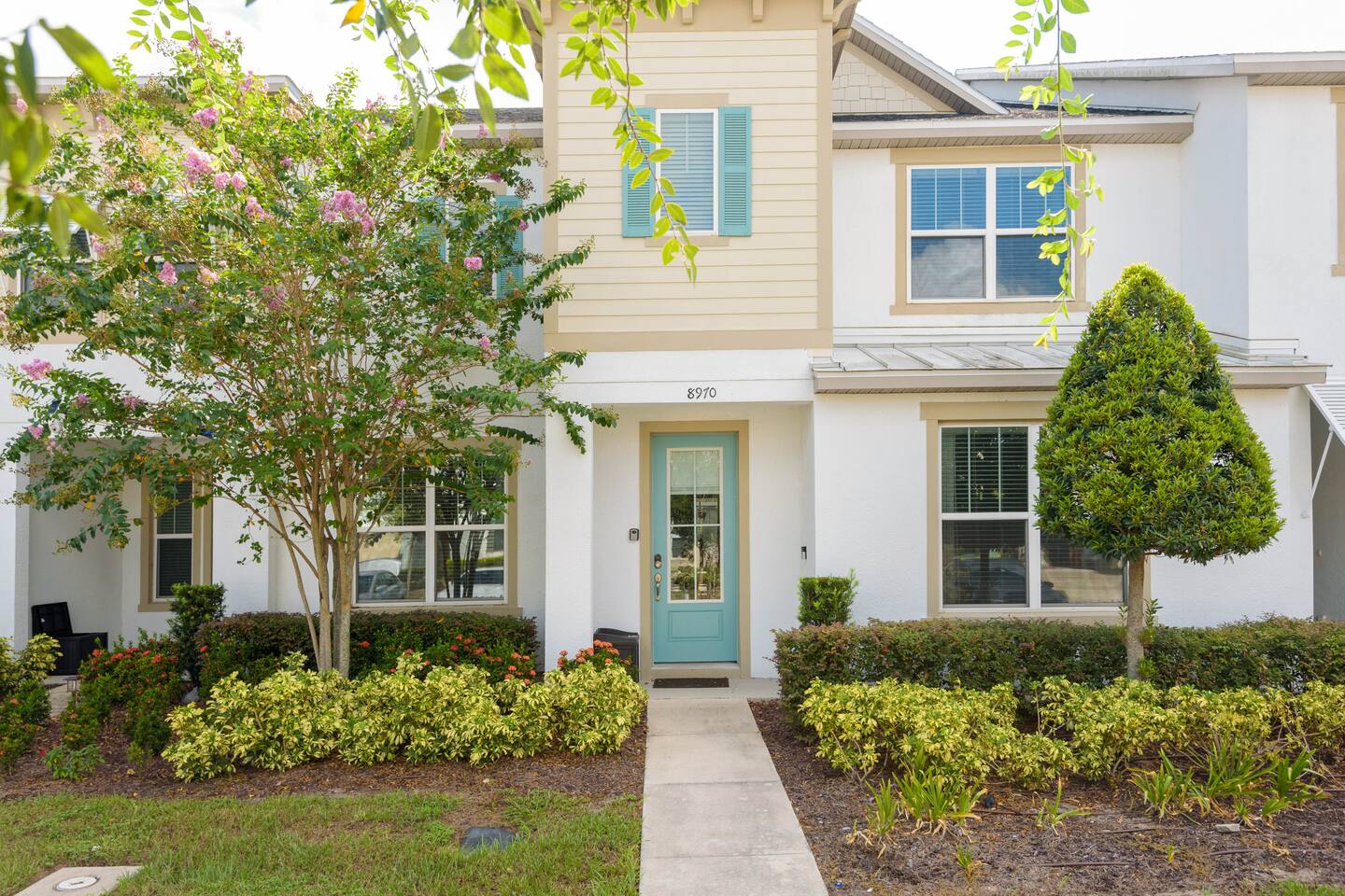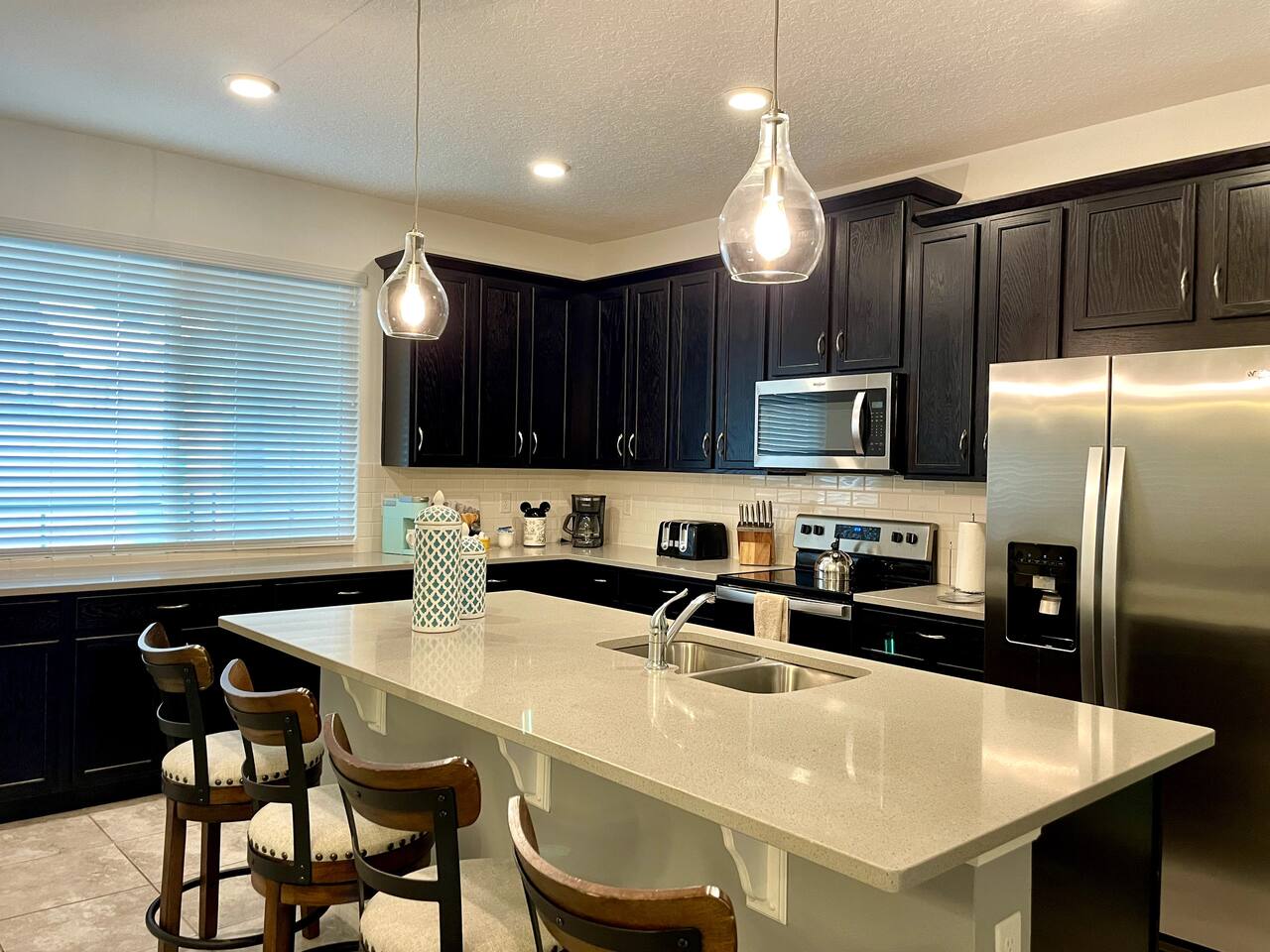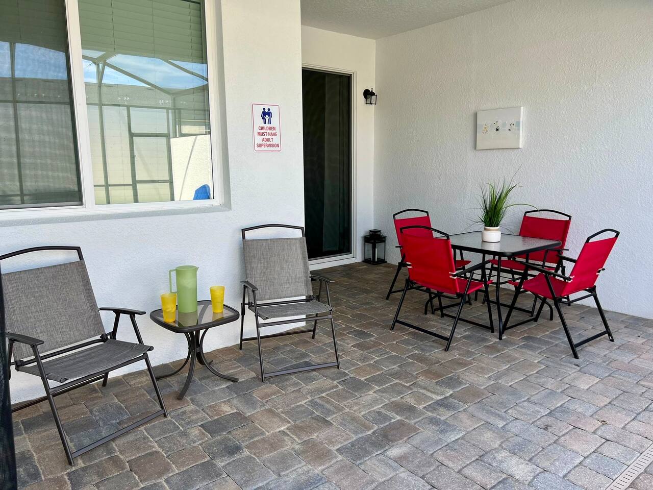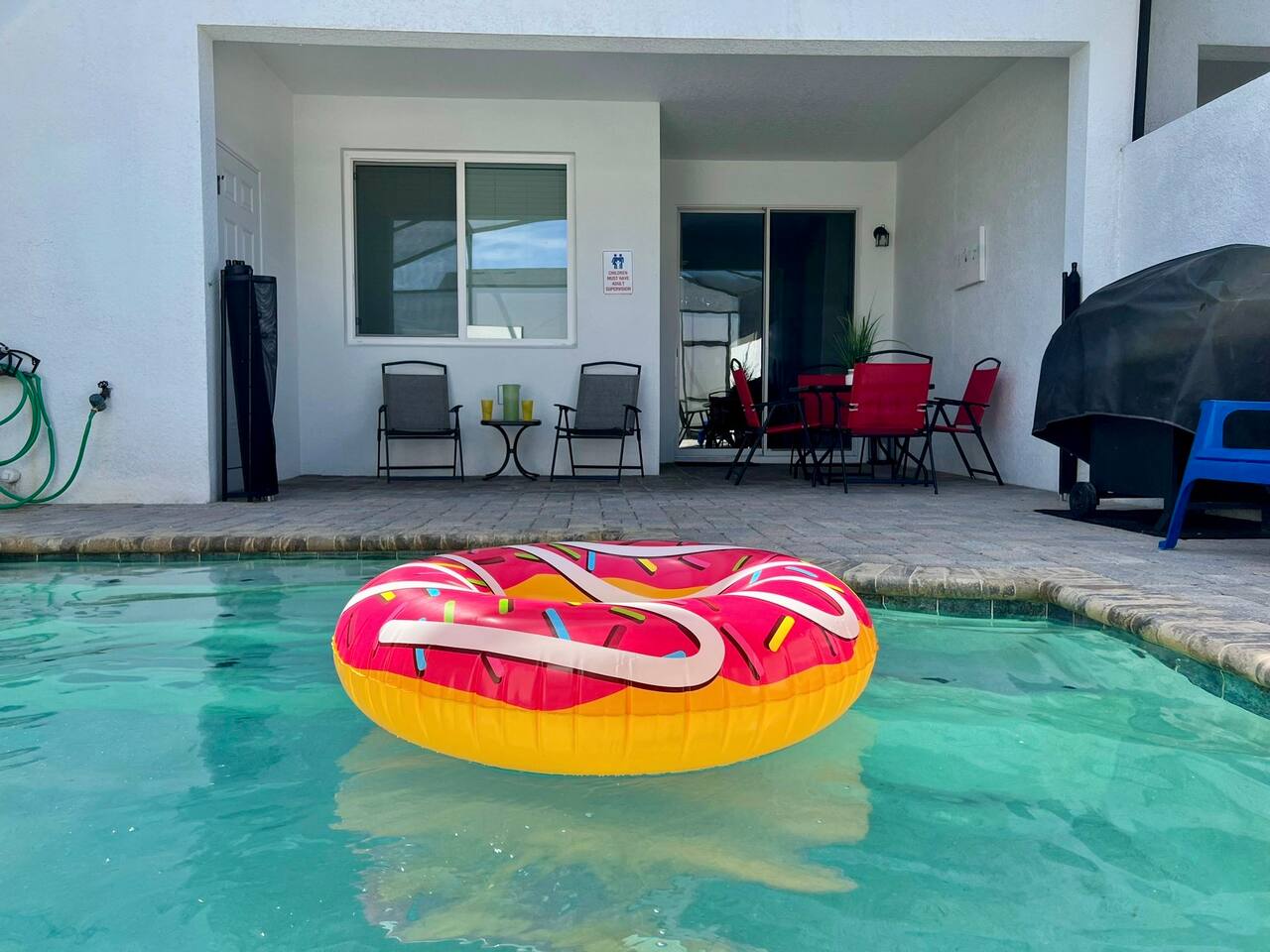 Townhouse style home, featuring 2 ensuites. Home boasts 4 beautifully appointed bedrooms with high quality mattresses and linens, 4 full bathrooms plus a pool half bath. No detail was spared int e kitchen either, which will please all lifestyle, from the eager snacker to the accomplished Home Chef. The large living spaces, ROKU-enabled TVs for major streaming and free Chanels second living space upstairs with the double sofa bed will ensure everyone enjoys gatherings and privacy as well. The pool patio is super fun with the BBQ Grill (Free to use), optionally heated Splash Pool and outdoor dining table. A baby gate is installed for safety.