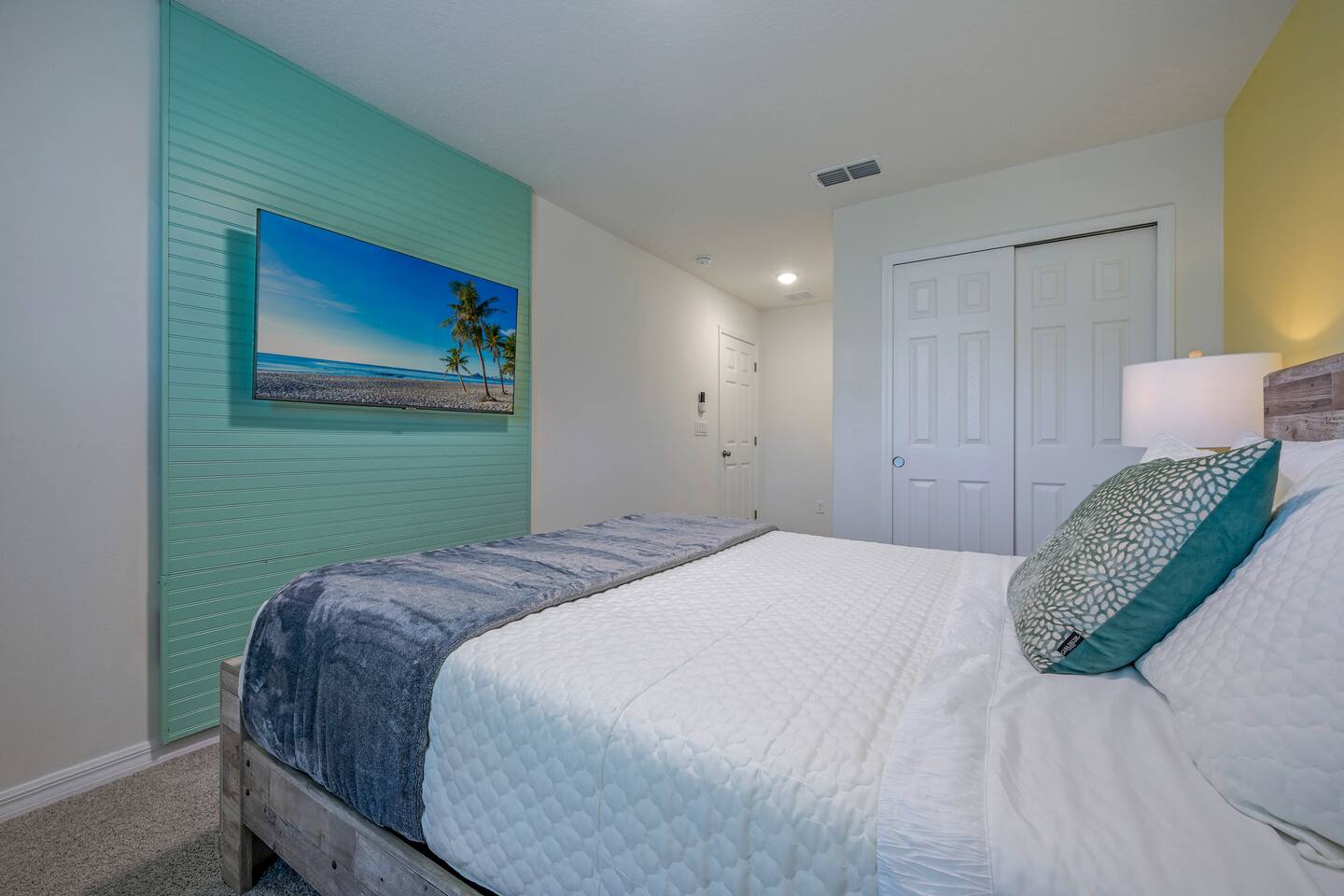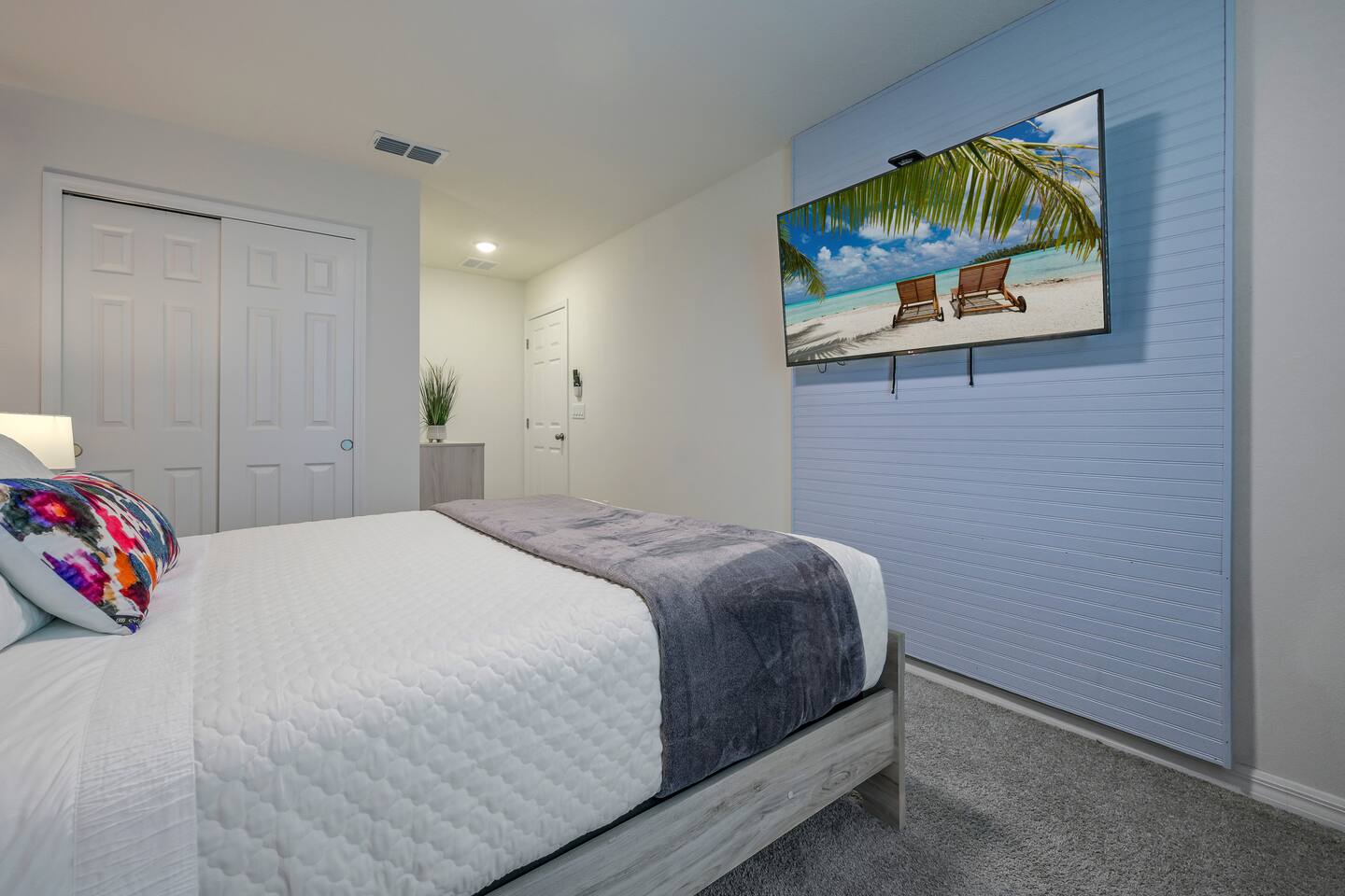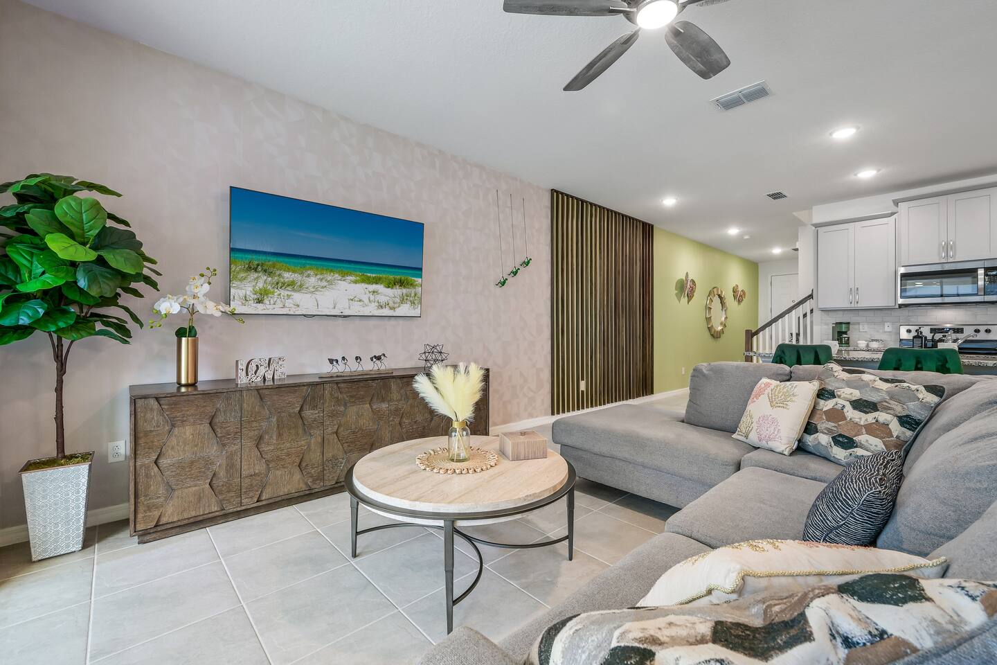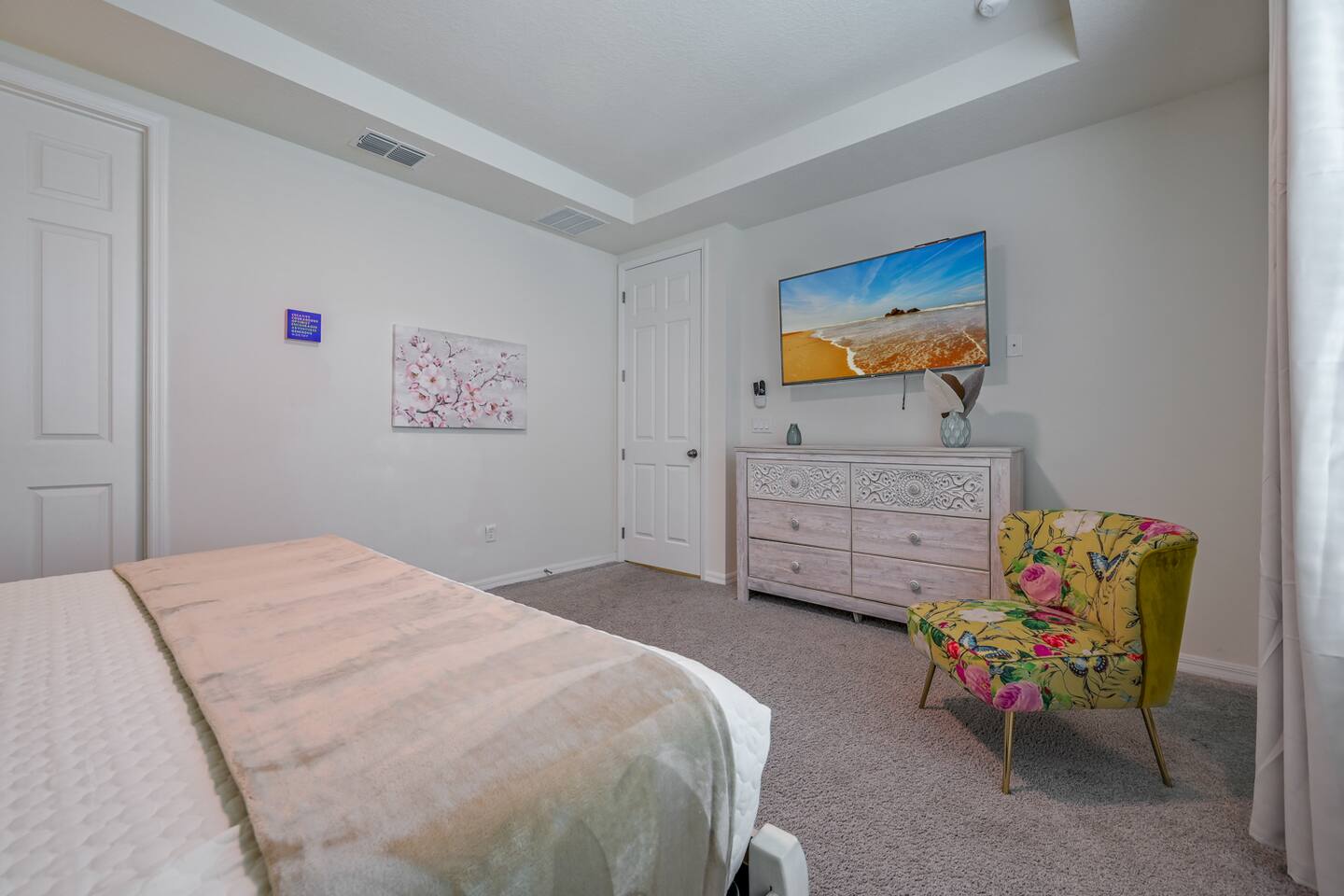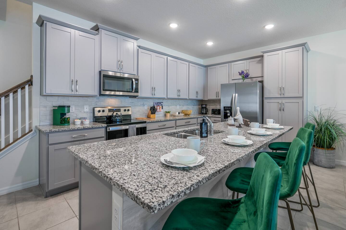 No details were spared on this gorgeous home with 3 full ensuites, open concept floor plan, elegant furnishings, and luxurious appointments. This Solara Resort townhome is the private home gem you were looking for! Solara Resort is a top rated gated resort community at the center of all of Orlando and Kissimmee’s exciting attractions. Located just a short 10 min drive from the gats of Walt Disney World, this stunning resort offers everything from a luxury clubhouse to expansive water complex and sports activities, so parks are optional! As a guest of Solara Resort, you can enjoy free, unlimited access to all resort amenities, including: -Heated Grand Pool -FlowRider Wave/Surf Simulator (Fee Required) -Poolside Cabanas -Pool Bar -Fitness Center -Outdoor Fitness Lawn -Sand Volleyball Court -Soccer Field -Full-sized Basketball Court -Indoor and Outdoor Lounges -Workstations -Tween/teen Hangout Center -Children’s Playground -Ice Cream Parlor -Bar and Grill -And more! THE HOME: The kitchen features every gadget to please every cook, from the fast-food connoisseur to the accomplished Home Chef. The large spaces and enormous island offer an array of appliances, custom cabinetry, and lots of seating options.Beautiful artwork and modern decor accents complete the look and feel of the elegant, yet comfortable spaces. All bedroom and living spaces feature their very own smart TVs, so gather 'round for a flick or game nights. THE ROOMS: The Master Bedroom features a king size bed with quality mattress and linens, an elegant headboard, and additional cozy seating that is ideal for curling up with a good book. The private master Bath boasts dual sinks and spacious countertops and shower Second Master ensuite features a Queen Size bed and super cool. tropical decor and a full bathroom with shower/tub combination The Third Master ensuite offers yet another Queen size bed with a beautiful blue accent wall, and walk-in shower in its very now bathroom Bedroom #4 also offers a Queen size bed with a shiplap headboard and beautiful colors for a restful night after the parks Bedroom #5 is a super fun themed room with two twin sized beds, wall-mounted television, large dresser and is located right next to the upstairs second living area, with a double sofa-bed (in case you want room to spread out), it's own TV and a detached bathroom, serving the living area and kid's themed room. Washer and dryer is located right inside the home and is free to sue-we even provide a starter pack with laundry pods!! Now-Step outside onto your very own private screened-in lanai for private fun it the home's very own Splash Pool or for lounging, dining out or grilling on the free BBQ. You may choose to heat the private pool for only $35 per night-recommended from November to April-please request immediately after booking and must have the heat turned on for the duration of the stay. Don't wait-this is a new listing from a highly experienced host and we would love to host you!