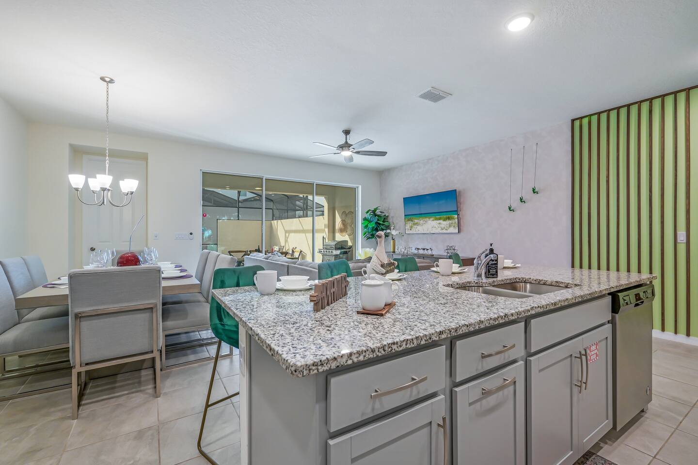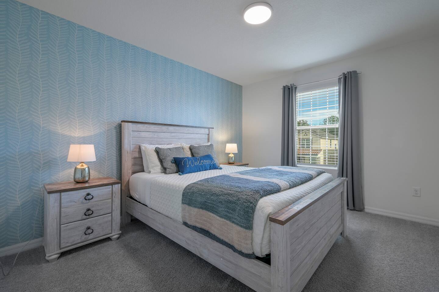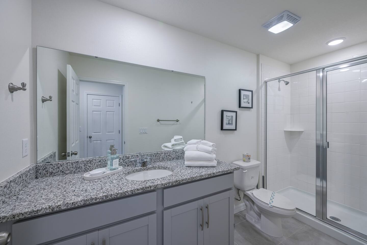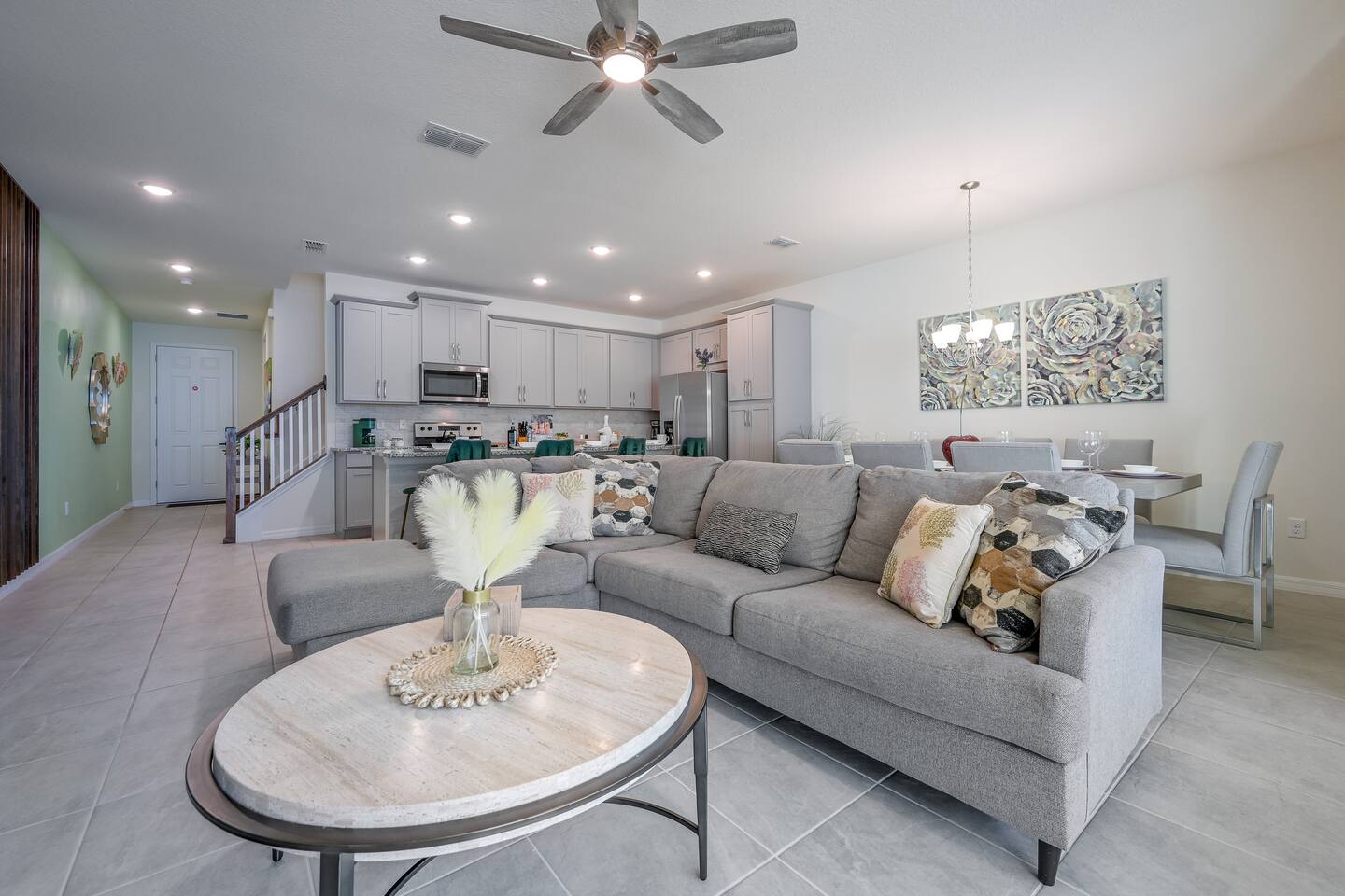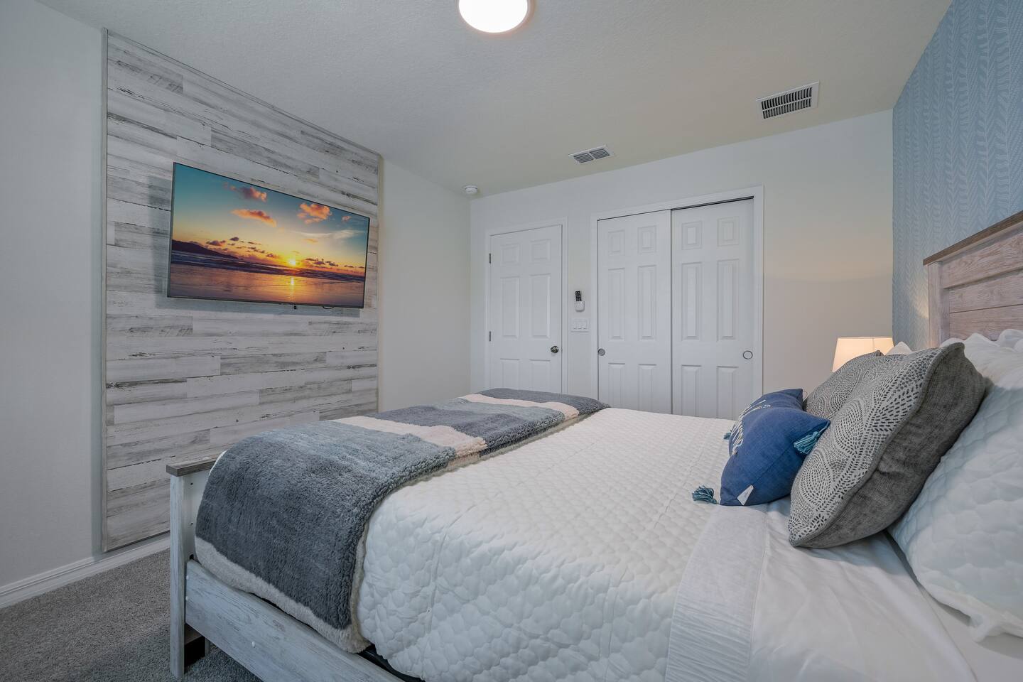 No details were spared on this gorgeous home with 3 full ensuites, open concept floor plan, elegant furnishings, and luxurious appointments. This Solara Resort townhome is the private home gem you were looking for! Solara Resort is a top rated gated resort community at the center of all of Orlando and Kissimmee’s exciting attractions. Located just a short 10 min drive from the gats of Walt Disney World, this stunning resort offers everything from a luxury clubhouse to expansive water complex and sports activities, so parks are optional! As a guest of Solara Resort, you can enjoy free, unlimited access to all resort amenities, including: -Heated Grand Pool -FlowRider Wave/Surf Simulator (Fee Required) -Poolside Cabanas -Pool Bar -Fitness Center -Outdoor Fitness Lawn -Sand Volleyball Court -Soccer Field -Full-sized Basketball Court -Indoor and Outdoor Lounges -Workstations -Tween/teen Hangout Center -Children’s Playground -Ice Cream Parlor -Bar and Grill -And more! THE HOME: The kitchen features every gadget to please every cook, from the fast-food connoisseur to the accomplished Home Chef. The large spaces and enormous island offer an array of appliances, custom cabinetry, and lots of seating options.Beautiful artwork and modern decor accents complete the look and feel of the elegant, yet comfortable spaces. All bedroom and living spaces feature their very own smart TVs, so gather 'round for a flick or game nights. THE ROOMS: The Master Bedroom features a king size bed with quality mattress and linens, an elegant headboard, and additional cozy seating that is ideal for curling up with a good book. The private master Bath boasts dual sinks and spacious countertops and shower Second Master ensuite features a Queen Size bed and super cool. tropical decor and a full bathroom with shower/tub combination The Third Master ensuite offers yet another Queen size bed with a beautiful blue accent wall, and walk-in shower in its very now bathroom Bedroom #4 also offers a Queen size bed with a shiplap headboard and beautiful colors for a restful night after the parks Bedroom #5 is a super fun themed room with two twin sized beds, wall-mounted television, large dresser and is located right next to the upstairs second living area, with a double sofa-bed (in case you want room to spread out), it's own TV and a detached bathroom, serving the living area and kid's themed room. Washer and dryer is located right inside the home and is free to sue-we even provide a starter pack with laundry pods!! Now-Step outside onto your very own private screened-in lanai for private fun it the home's very own Splash Pool or for lounging, dining out or grilling on the free BBQ. You may choose to heat the private pool for only $35 per night-recommended from November to April-please request immediately after booking and must have the heat turned on for the duration of the stay. Don't wait-this is a new listing from a highly experienced host and we would love to host you!