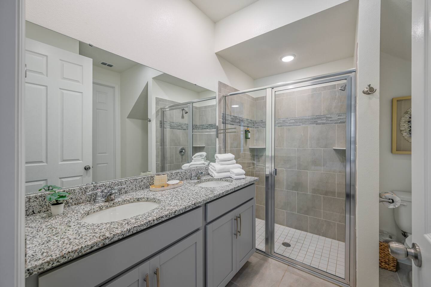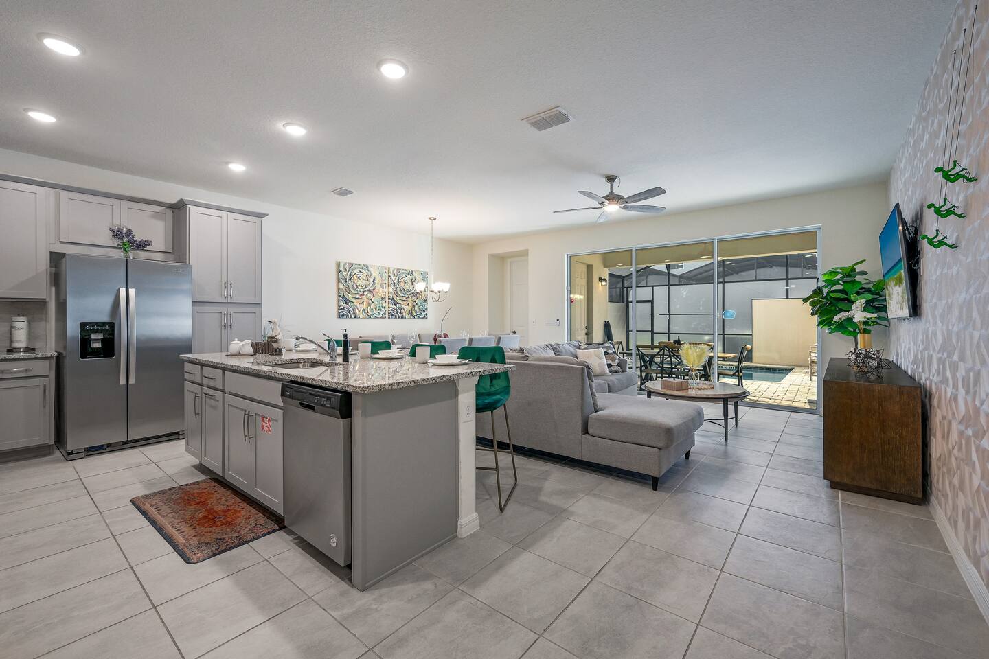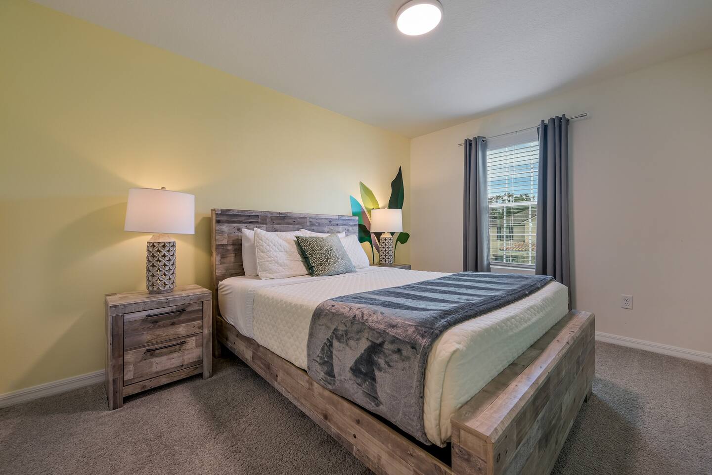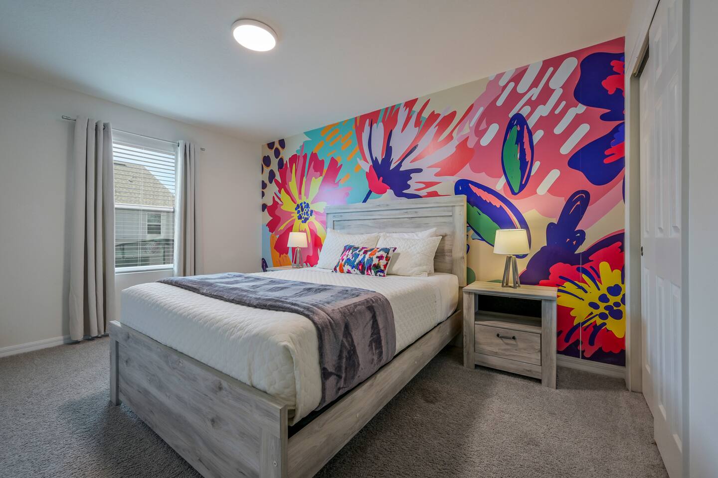 No details were spared on this gorgeous home with 3 full ensuites, open concept floor plan, elegant furnishings, and luxurious appointments. This Solara Resort townhome is the private home gem you were looking for! Solara Resort is a top rated gated resort community at the center of all of Orlando and Kissimmee’s exciting attractions. Located just a short 10 min drive from the gats of Walt Disney World, this stunning resort offers everything from a luxury clubhouse to expansive water complex and sports activities, so parks are optional! As a guest of Solara Resort, you can enjoy free, unlimited access to all resort amenities, including: -Heated Grand Pool -FlowRider Wave/Surf Simulator (Fee Required) -Poolside Cabanas -Pool Bar -Fitness Center -Outdoor Fitness Lawn -Sand Volleyball Court -Soccer Field -Full-sized Basketball Court -Indoor and Outdoor Lounges -Workstations -Tween/teen Hangout Center -Children’s Playground -Ice Cream Parlor -Bar and Grill -And more! THE HOME: The kitchen features every gadget to please every cook, from the fast-food connoisseur to the accomplished Home Chef. The large spaces and enormous island offer an array of appliances, custom cabinetry, and lots of seating options.Beautiful artwork and modern decor accents complete the look and feel of the elegant, yet comfortable spaces. All bedroom and living spaces feature their very own smart TVs, so gather 'round for a flick or game nights. THE ROOMS: The Master Bedroom features a king size bed with quality mattress and linens, an elegant headboard, and additional cozy seating that is ideal for curling up with a good book. The private master Bath boasts dual sinks and spacious countertops and shower Second Master ensuite features a Queen Size bed and super cool. tropical decor and a full bathroom with shower/tub combination The Third Master ensuite offers yet another Queen size bed with a beautiful blue accent wall, and walk-in shower in its very now bathroom Bedroom #4 also offers a Queen size bed with a shiplap headboard and beautiful colors for a restful night after the parks Bedroom #5 is a super fun themed room with two twin sized beds, wall-mounted television, large dresser and is located right next to the upstairs second living area, with a double sofa-bed (in case you want room to spread out), it's own TV and a detached bathroom, serving the living area and kid's themed room. Washer and dryer is located right inside the home and is free to sue-we even provide a starter pack with laundry pods!! Now-Step outside onto your very own private screened-in lanai for private fun it the home's very own Splash Pool or for lounging, dining out or grilling on the free BBQ. You may choose to heat the private pool for only $35 per night-recommended from November to April-please request immediately after booking and must have the heat turned on for the duration of the stay. Don't wait-this is a new listing from a highly experienced host and we would love to host you!